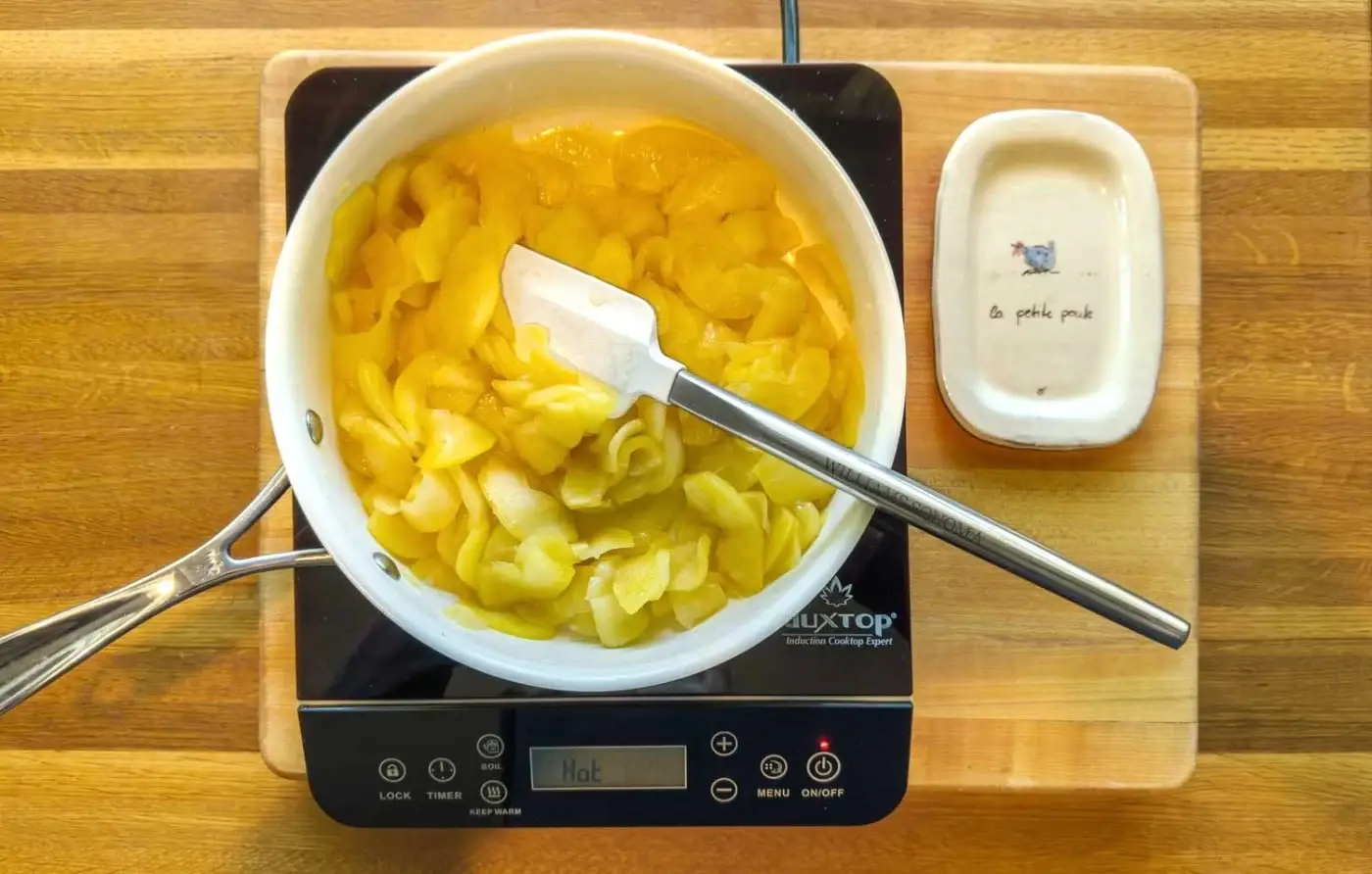 - Place the apples, sugar, lemon juice, butter, and salt in a large saucepan. Cook over medium heat, stirring occasionally, until the apples are tender and the juices have almost all evaporated with only a little syrup left in the bottom of the pan. This takes about 10-12 minutes. Add the Calvados and cook for another minute or 2 until it has mostly evaporated. Remove from the heat and set aside. Allow the apples to cool completely to room temperature before placing them on the crust.