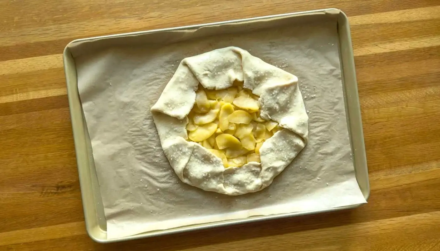 - Spread the cooled apples in the center of the dough, leaving about 3 inches bare along the edges. Fold the dough in over the apples, pleating as you go. Chill for 30 minutes. Remove from the fridge and lightly spray the exposed dough with water. Sprinkle the dough with sparkling sugar. Bake for 1 hour. Remove from the oven and place the pan on a wire rack. Immediately sprinkle the exposed apples with 1 tablespoon light brown sugar and using a kitchen torch, melt the brown sugar until it bubbles. Let cool, slice and serve, but this is especially delicious served warm with or without a scoop of vanilla ice cream. Enjoy!