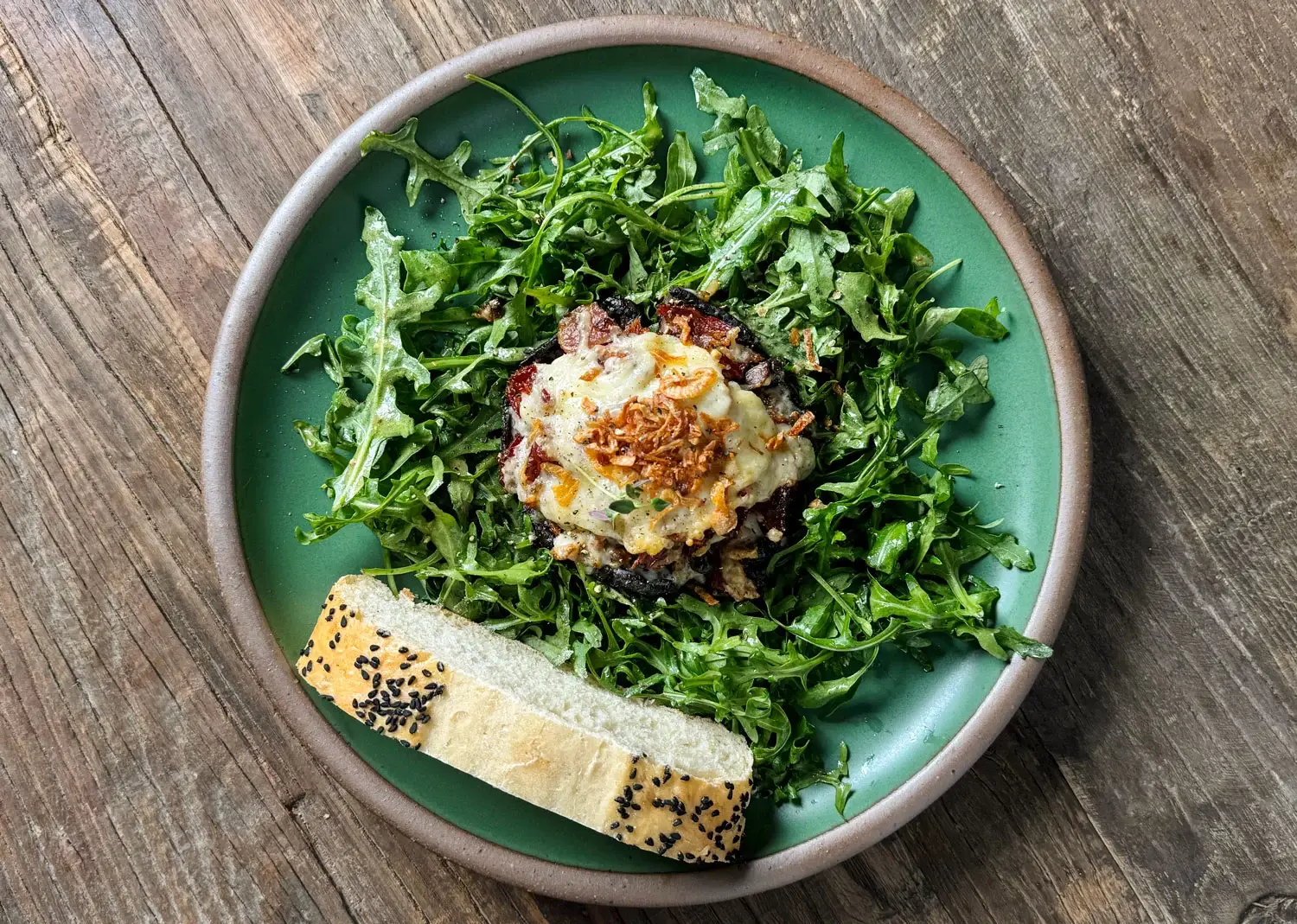 servingsPortobello mushroom caps are stuffed with plenty of bacon, onion, garlic, and sun dried tomatoes before being heaped with gruyere cheese and placed in the oven. I served them on top of a baby arugula salad and sprinkled the tops with fried shallots. Now this is a great salad, folks!