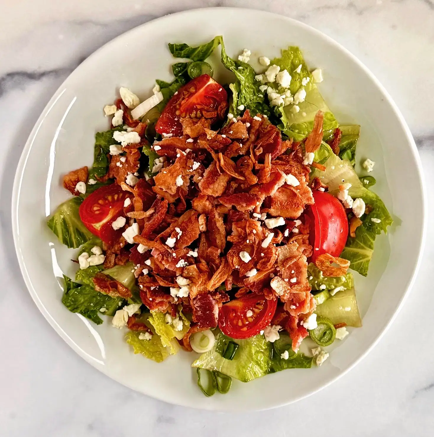 servingsPlenty of crisp bacon tops a chopped salad made with romaine lettuce, tomatoes which are salted and drained, sliced scallions, blue cheese, and crispy fried shallots. A simple dressing of tomato vinegar, red wine vinegar, and olive oil is all that's needed to finish off this extremely satisfying salad.