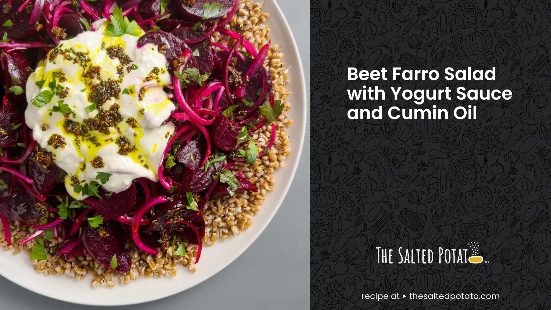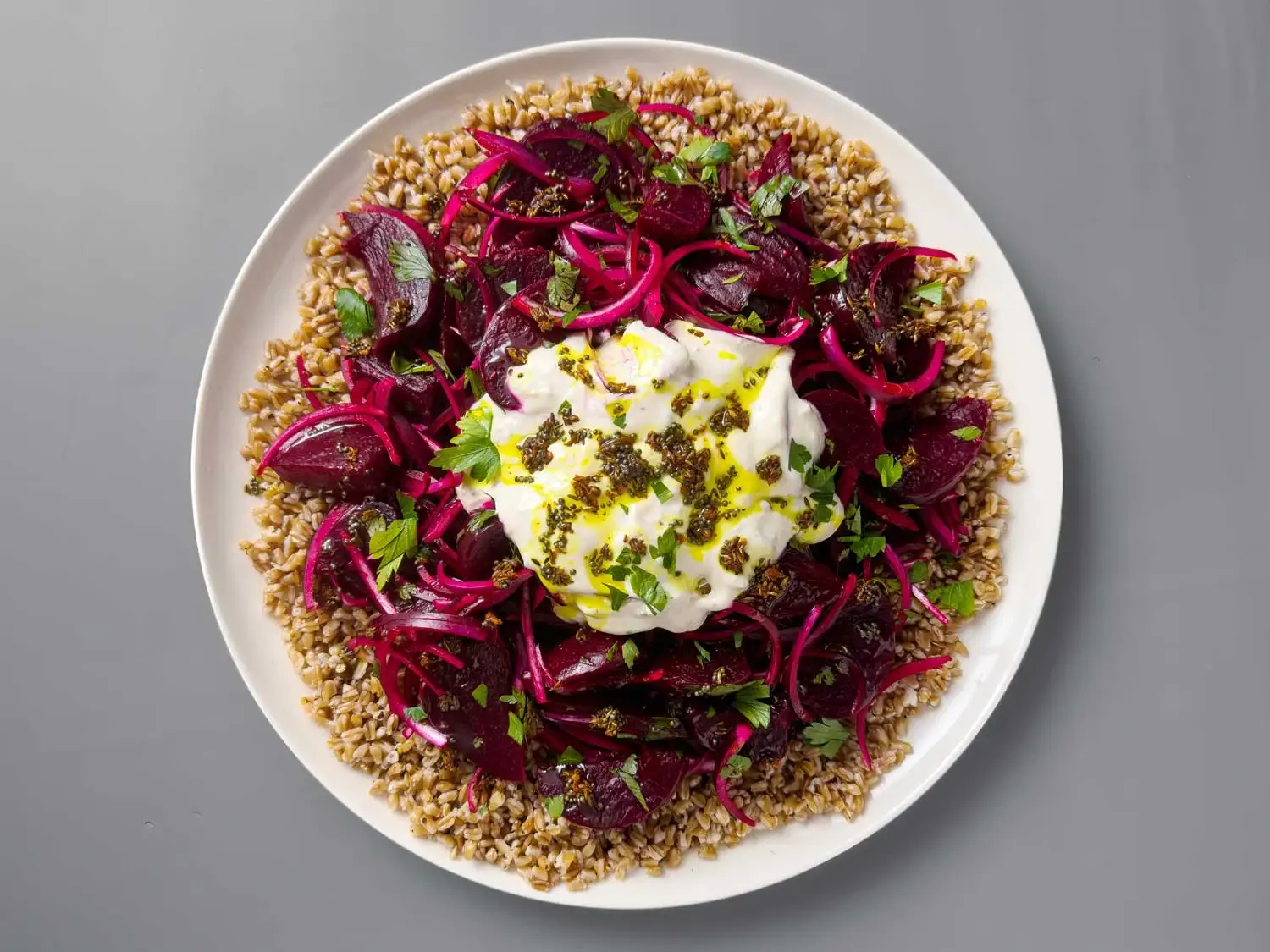 Beet Farro Salad with Yogurt Sauce and Cumin Oil