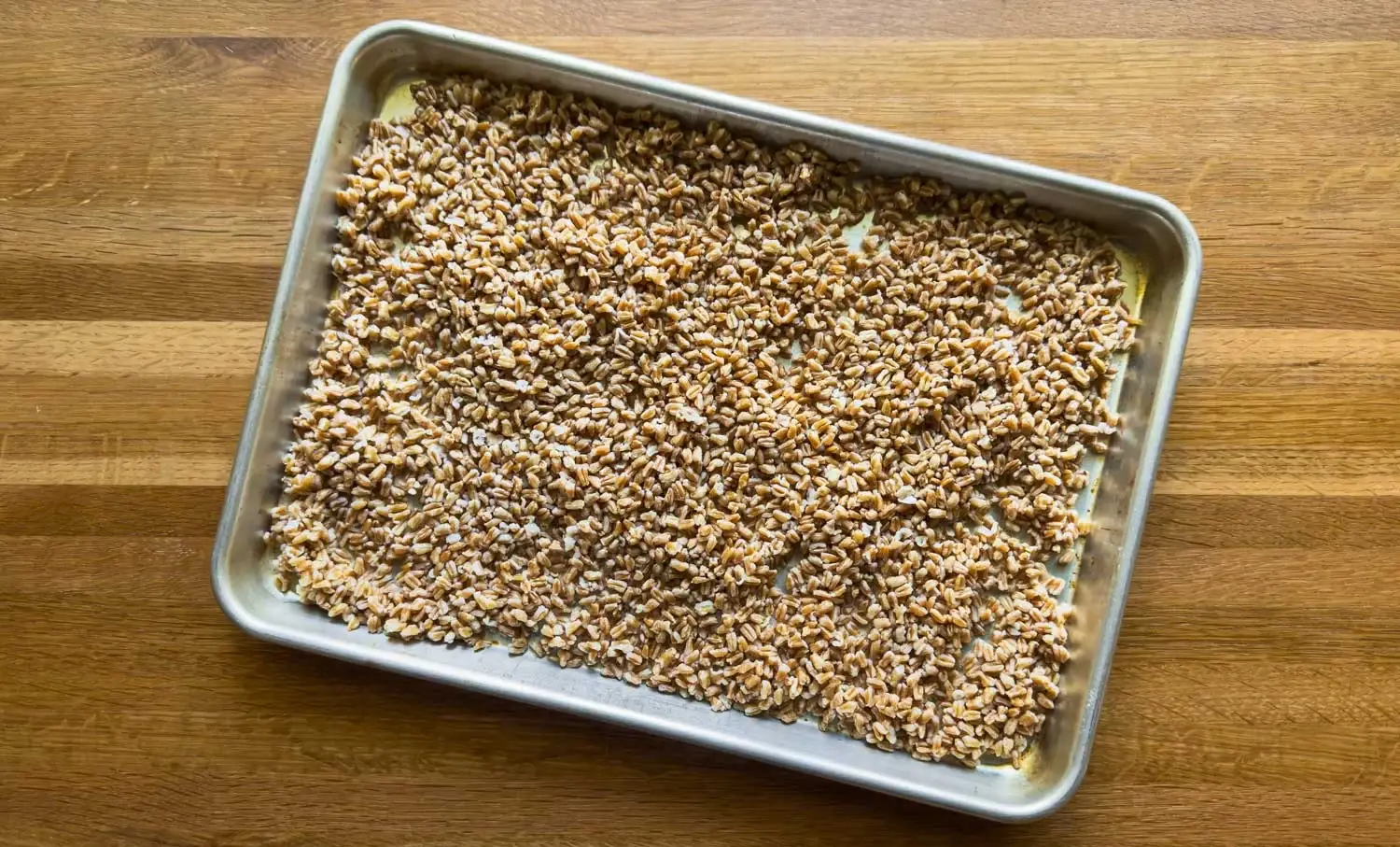 - Rinse the farro * in a strainer. Bring a large pot of salted water to boiling. Add the farro, lower the heat to medium high and cook for 30 minutes. Drain the farro and spread it out on a sheet pan to cool. Once cooled, place it in a bowl, add 1 tablespoon olive oil, a pinch of salt, several grinds of black pepper and mix thoroughly. Set aside.