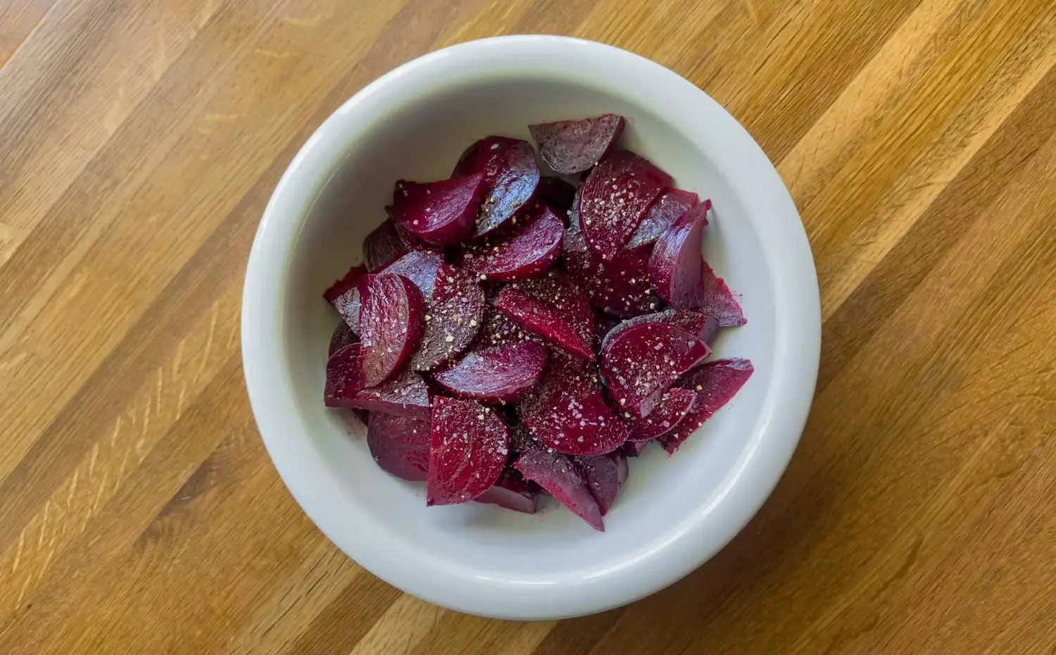 - Place the beets on a large sheet of foil, drizzle with a little olive oil. Close the foil up tightly and place on a sheet pan. Roast in the oven for 1 to 1 1/2 hours, depending on the size of your beets, checking after 1 hour to see if they are tender. Set aside and let cool until only slightly warm. Peel the beets, slice into 1/2 inch to 3/4 inch wedges and place in a bowl. Sprinkle with several pinches of kosher salt, a few grinds of black pepper and drizzle on the Calamansi vinegar .* Stir gently and set aside to cool completely.