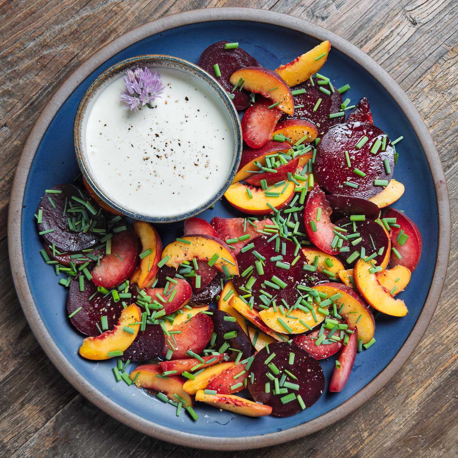 servingsRoasted beets, sliced plums, nectarines, and peaches are served with a dressing made with feta cheese, buttermilk, heavy cream, olive oil, and lemon juice. Drizzle a little maple syrup on top of the beets and fruit, along with the reserved drippings from the beets, add plenty of snipped chives, and you've got one fabulous summer side dish!