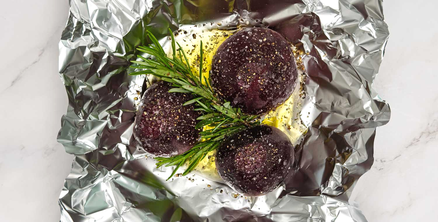 - Preheat the oven to 425° with a rack in the middle. Trim off the tops and bottoms of the beets. Place the beets and rosemary on a large piece of heavy duty aluminum foil. Drizzle with 1/4 cup olive oil and sprinkle with 1/2 teaspoon kosher salt and a few grinds of black pepper. Seal the foil and place in a small baking dish. Roast in the oven for 1 hour. Remove from the oven and let sit for a half hour until the steam inside the packet has subsided. Break open the packet of beets and let cool until they’re comfortable to handle. Remove the rosemary, but save all the juices. Using a paper towel, rub off the skins of the beets. Slice into 1/4 inch thick rounds. Set aside.