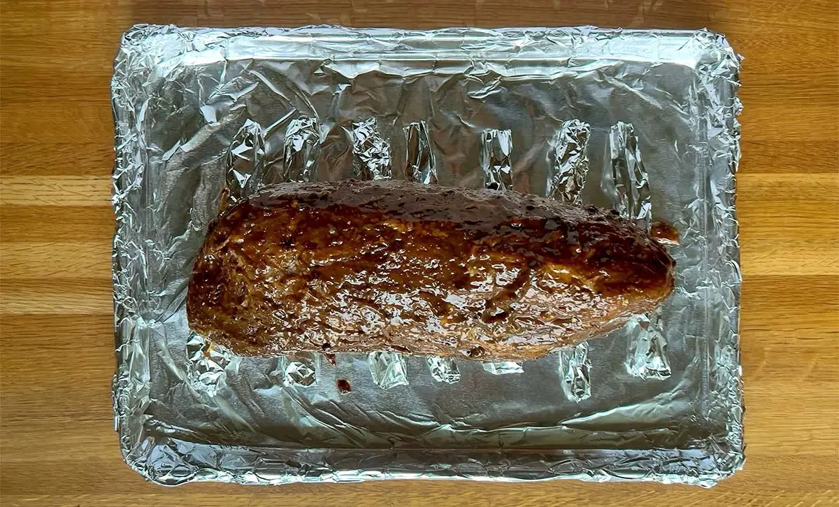 Once again, I use my technique consisting of placing rolled up logs of foil in a foil lined sheet pan, topping them with the meat and roasting it. No cleanup of any kind is involved. And I haven’t ruined a metal rack in the process.