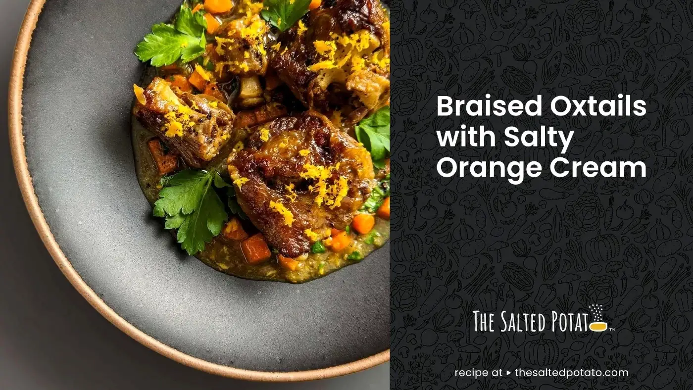 - Cover, put in the oven and bake for 2 hours. Remove the lid and cook for an additional 40 minutes. Stir in the carrots and bake for another 20 minutes. Remove from the oven, remove the oxtails from the pot, place in a bowl and keep covered. Let the sauce sit for 10 - 15 minutes. Skim off as much oil as possible. Stir in the Salty Orange Cream. Taste for seasoning. I purposely went light on salt when I made this because I knew I the Salty Orange Cream would contain plenty. Reheat over low heat if it needs it. Right before serving, stir in the chopped parsley. Spoon some of the sauce onto serving plates, top with the oxtails, garnish with orange zest, whole parsley leaves, and black pepper. Enjoy!