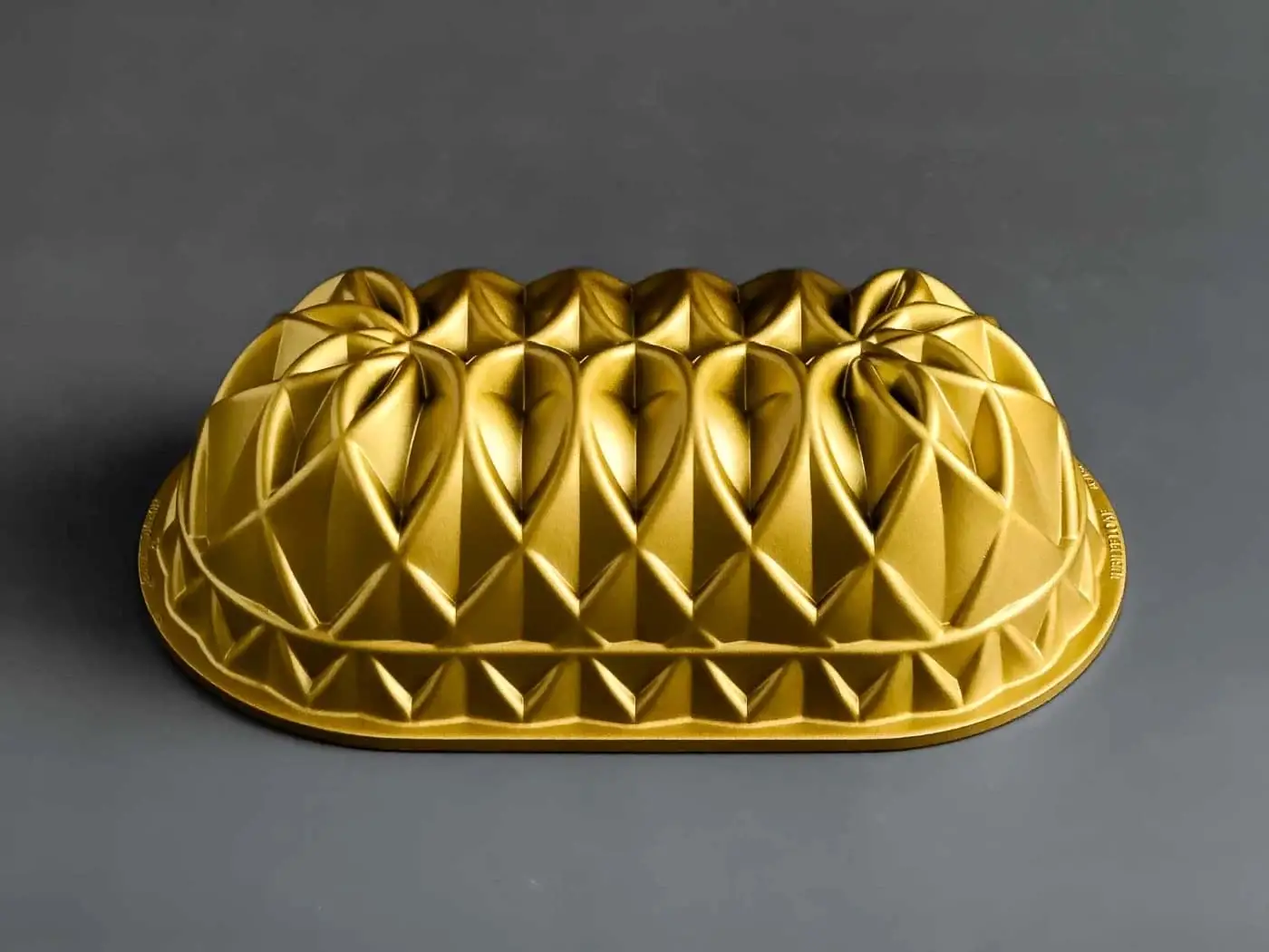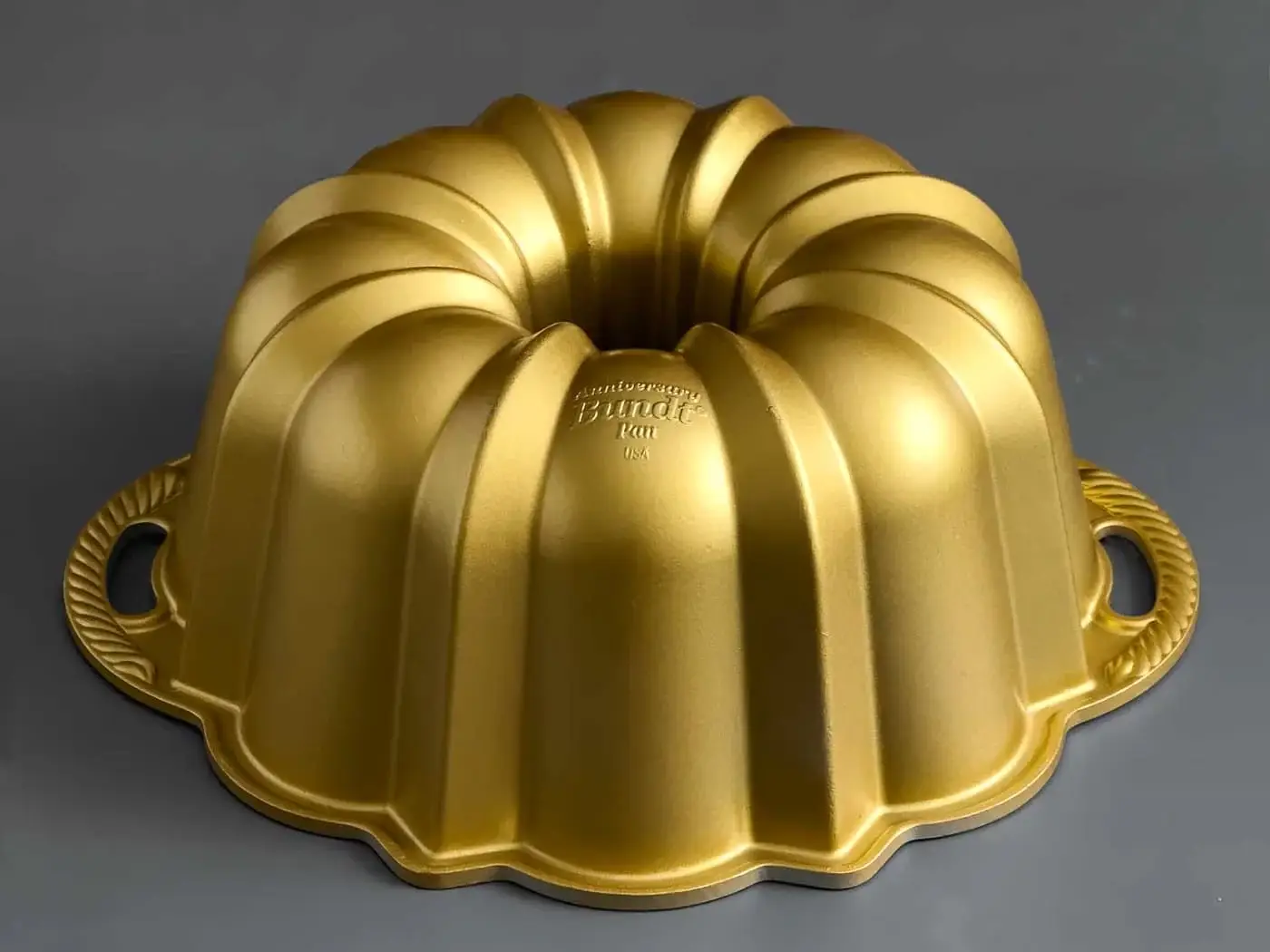 Then there are the different shapes to take into account and I give thought as to what shape to use for the particular cake I will be baking. If I’m making a cake that I know will have a dripping glaze, some shapes are much more conducive to a prettier outcome than others. The original large model works well for those kinds of recipes, as does this pan – Brilliance Bundt Pan Gold .