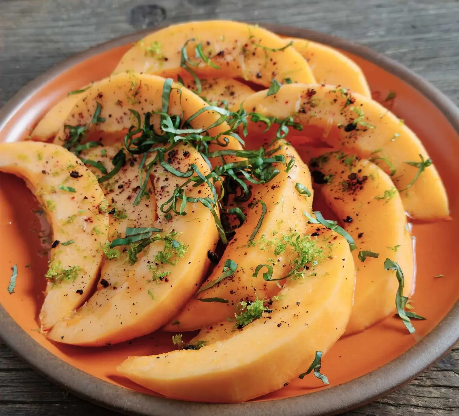 - Arrange the cantaloupe slices on a platter. In a small bowl stir together the fresh lime juice and honey and spoon it over the melon slices. Sprinkle with either crushed mountain pepperberries * or black peppercorns. Scatter the lime zest and basil on top, serve, and Enjoy!
