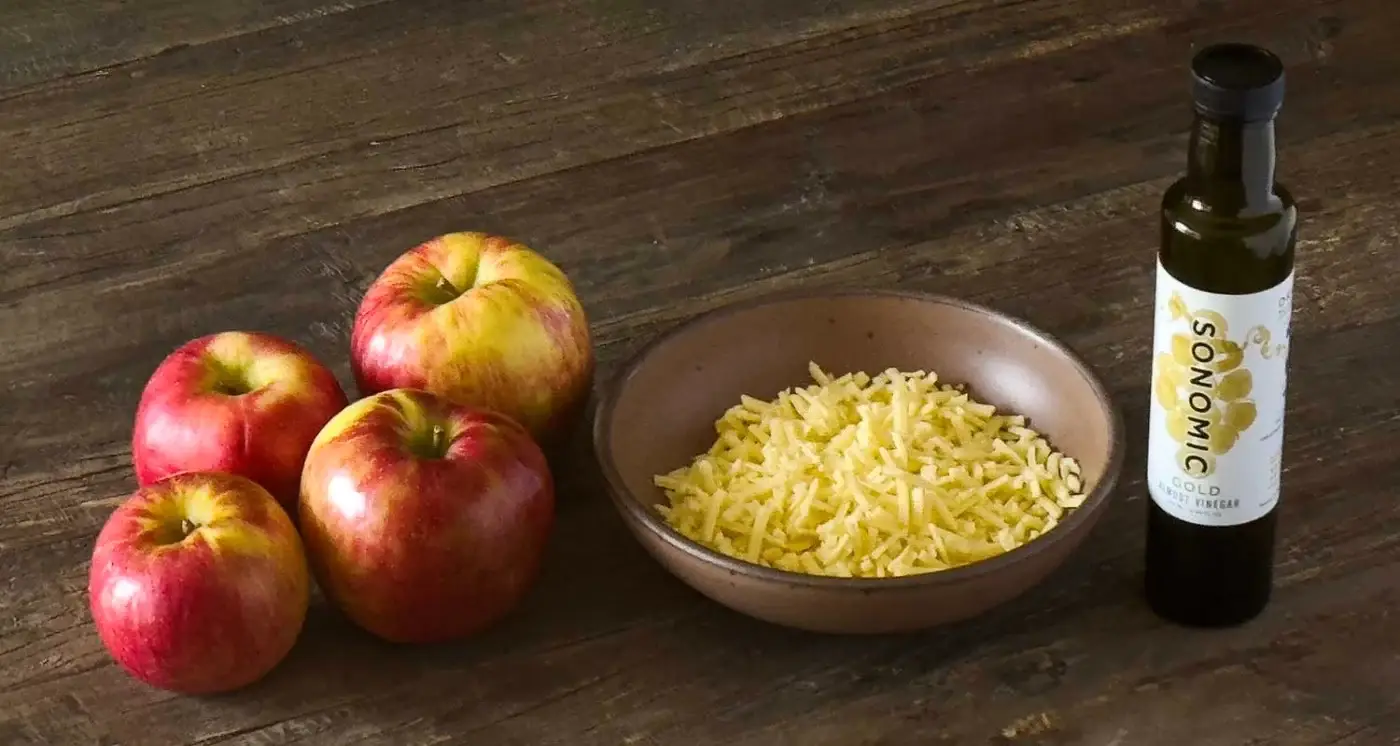 - In a large bowl, stir together the apple slices, 2 teaspoons Sonomic Gold Almost Vinegar, 50 grams (1/4 cup) sugar, 1 tablespoon flour, cinnamon, and salt.