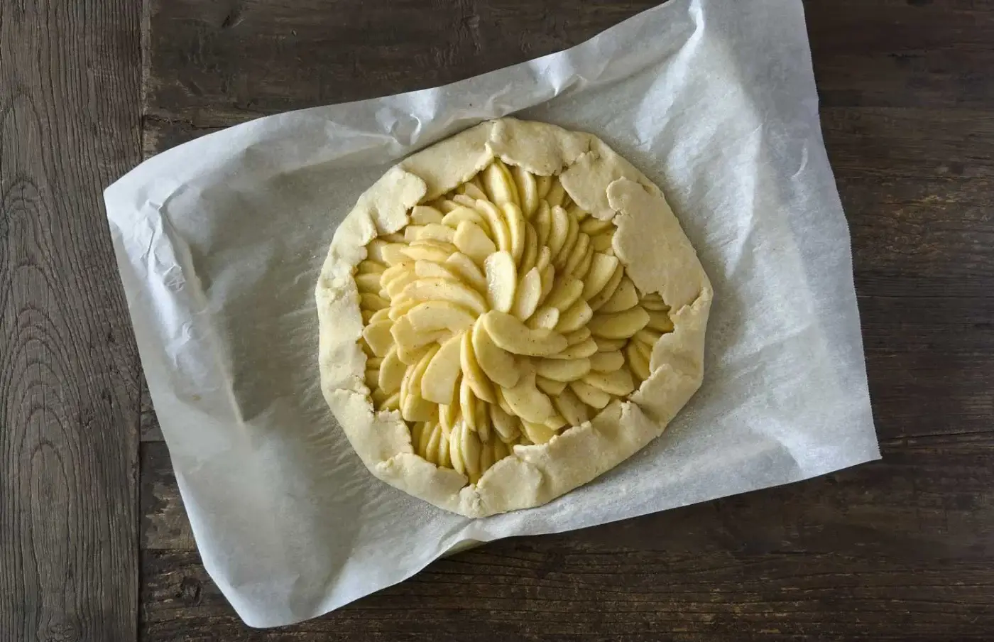 - Line a half sheet pan with parchment paper and set aside. On a generously floured surface, roll out the dough into a 17 inch round. Place it in the lined sheet pan (the edges will hang over the sides of the pan). In a small bowl, stir together 25 grams (2 tablespoons) sugar and 1 tablespoon flour. Sprinkle it over the dough. Arrange the apples in tight overlapping concentric circles on the dough to within 2 inches of the edge, reserving the juices in the bottom of the bowl. Fold the dough over the apples, pleating the dough as you go along. No need to worry about it being perfect, as this is a rustic dessert.