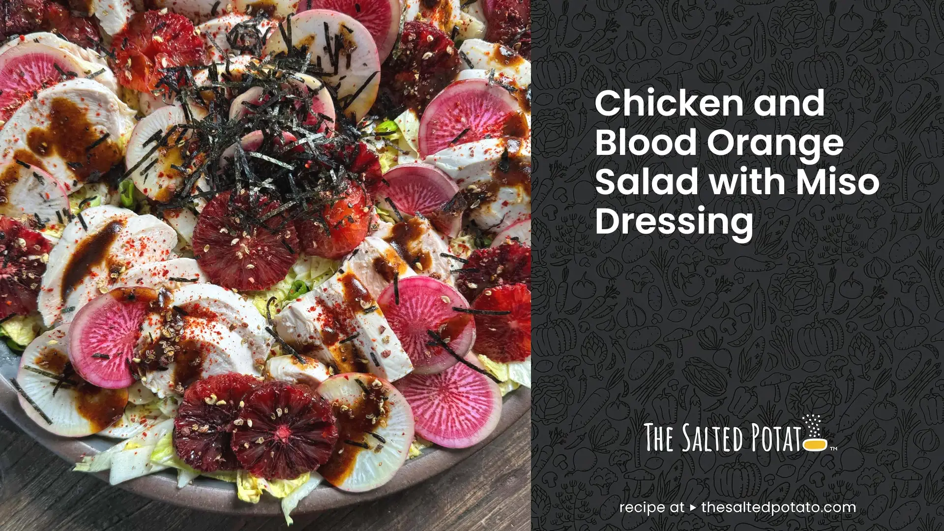 servingsEasy poached chicken breasts are sliced and layered onto a salad of Napa cabbage, which has been dressed with roasted sesame oil, along with blood oranges, watermelon radishes, a little Sichuan peppercorn, and nori. Miso dressing is spooned on top. How can this be anything but great?!