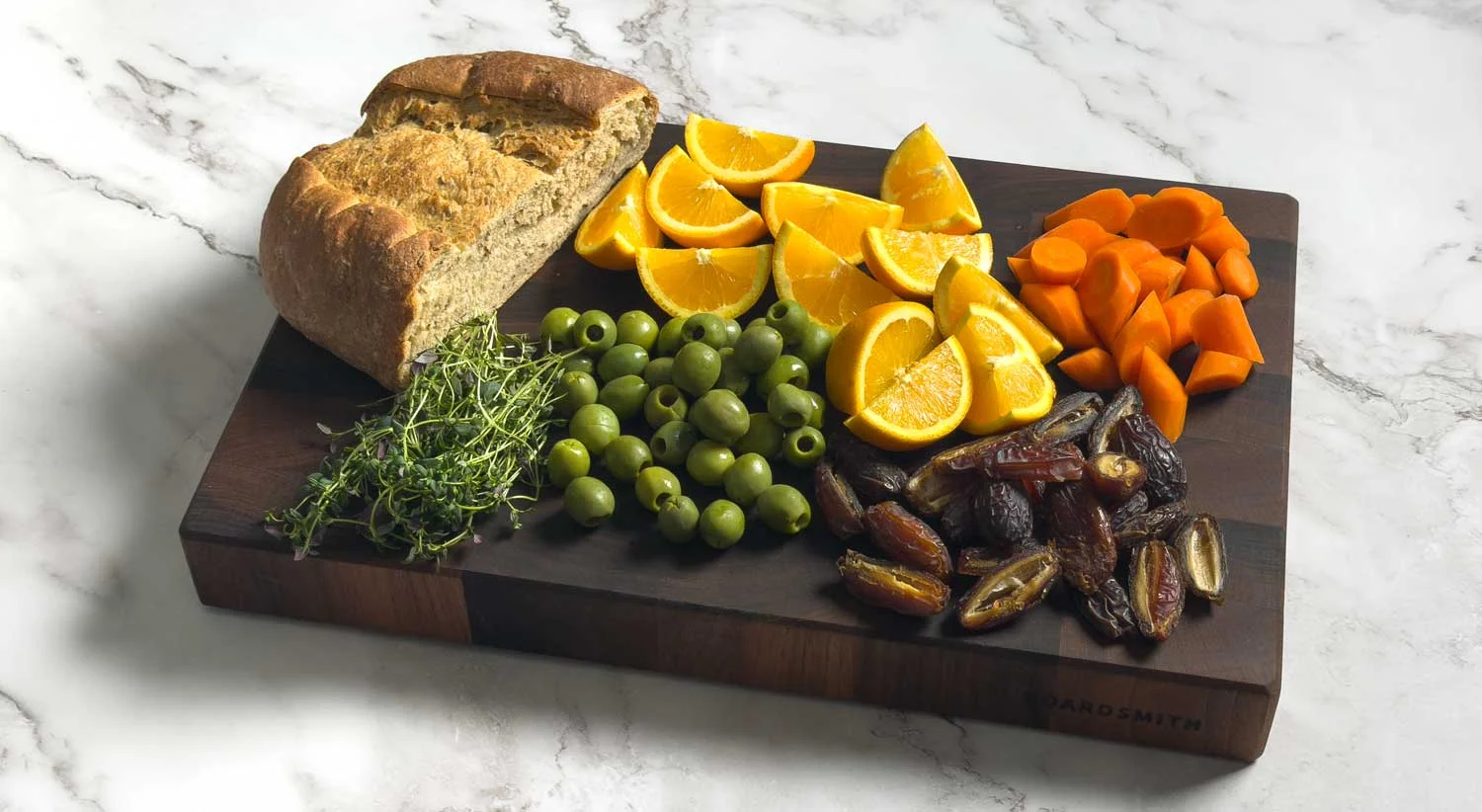 - Preheat oven to 425° with one rack in the center and the other in the top third one the oven. On a half sheet pan (13 x 18 inches), toss together the bread, orange wedges, olives, dates, carrots, vinegar, olive oil, 1 teaspoon salt, and plenty of black pepper. Tuck the thyme sprigs throughout the pan.