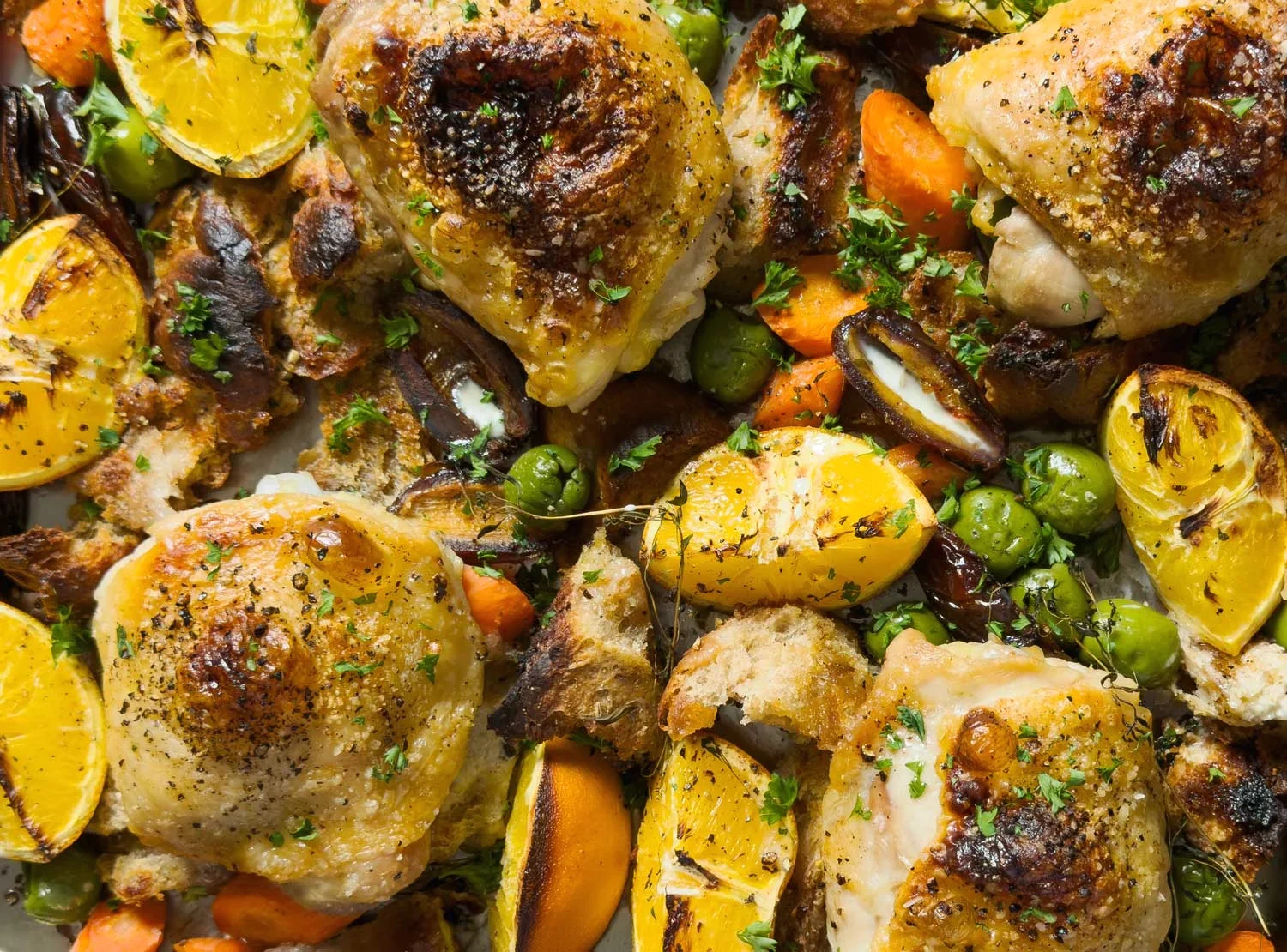 servingsChicken thighs are roasted on a sheet pan, along with chunks of rye bread, castelvetrano olives, orange wedges, Medjool dates, and carrots that are tossed in olive oil and red wine vinegar. A little cream is spooned on top right before serving. Super easy and extremely delicious!