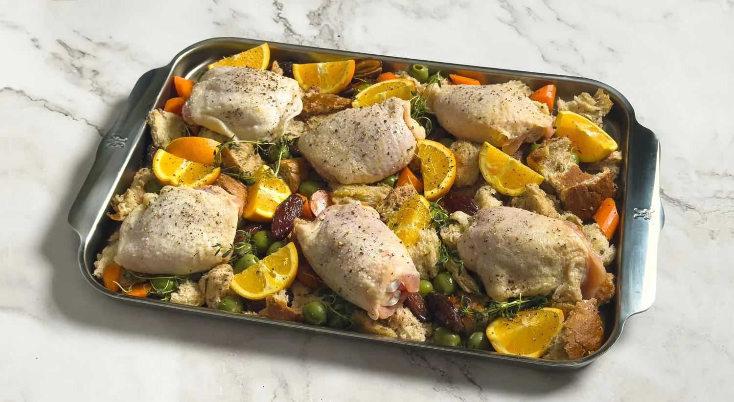 Chicken, Olive, Orange, and Rye Bread Tray Bake