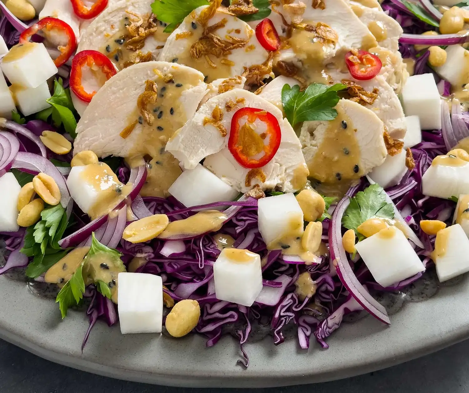 servingsPoached chicken breasts are sliced and placed on top of sliced red cabbage, red onions, Korean radish, parsley, salted peanuts and fried shallots. A gorgeous dressing made with tahini and sesame oil, amongst other things is spooned over the top. How's that for a fabulous meal all in one??