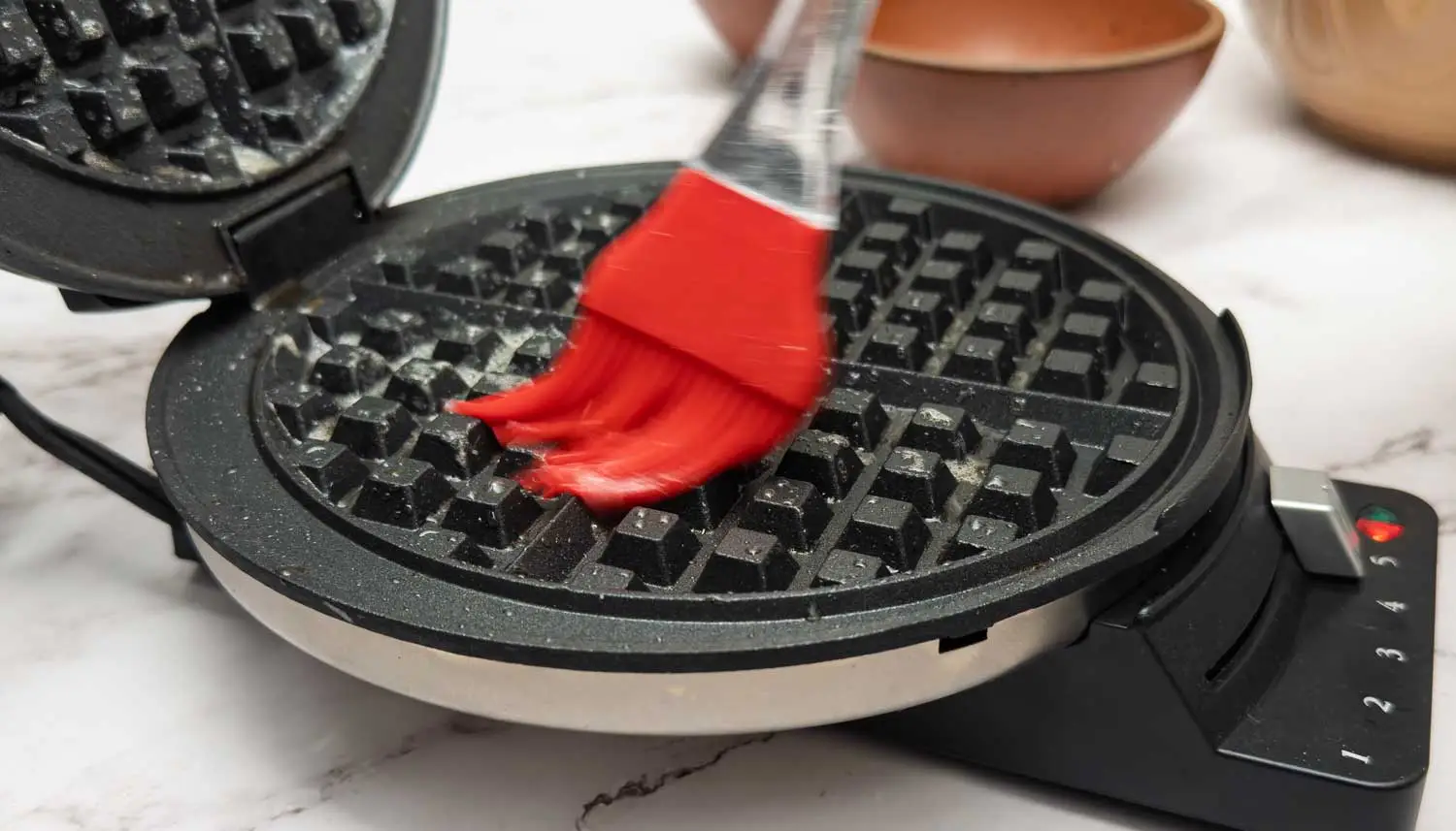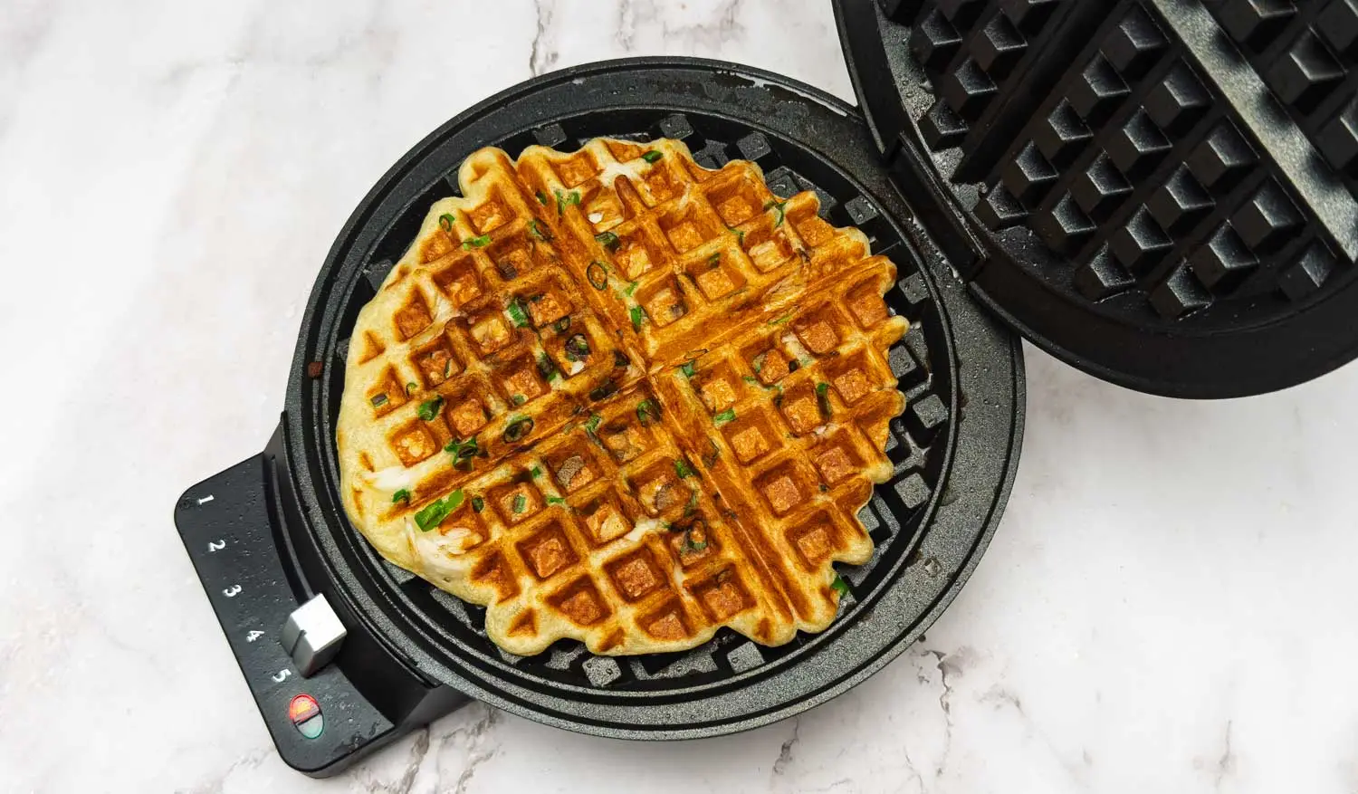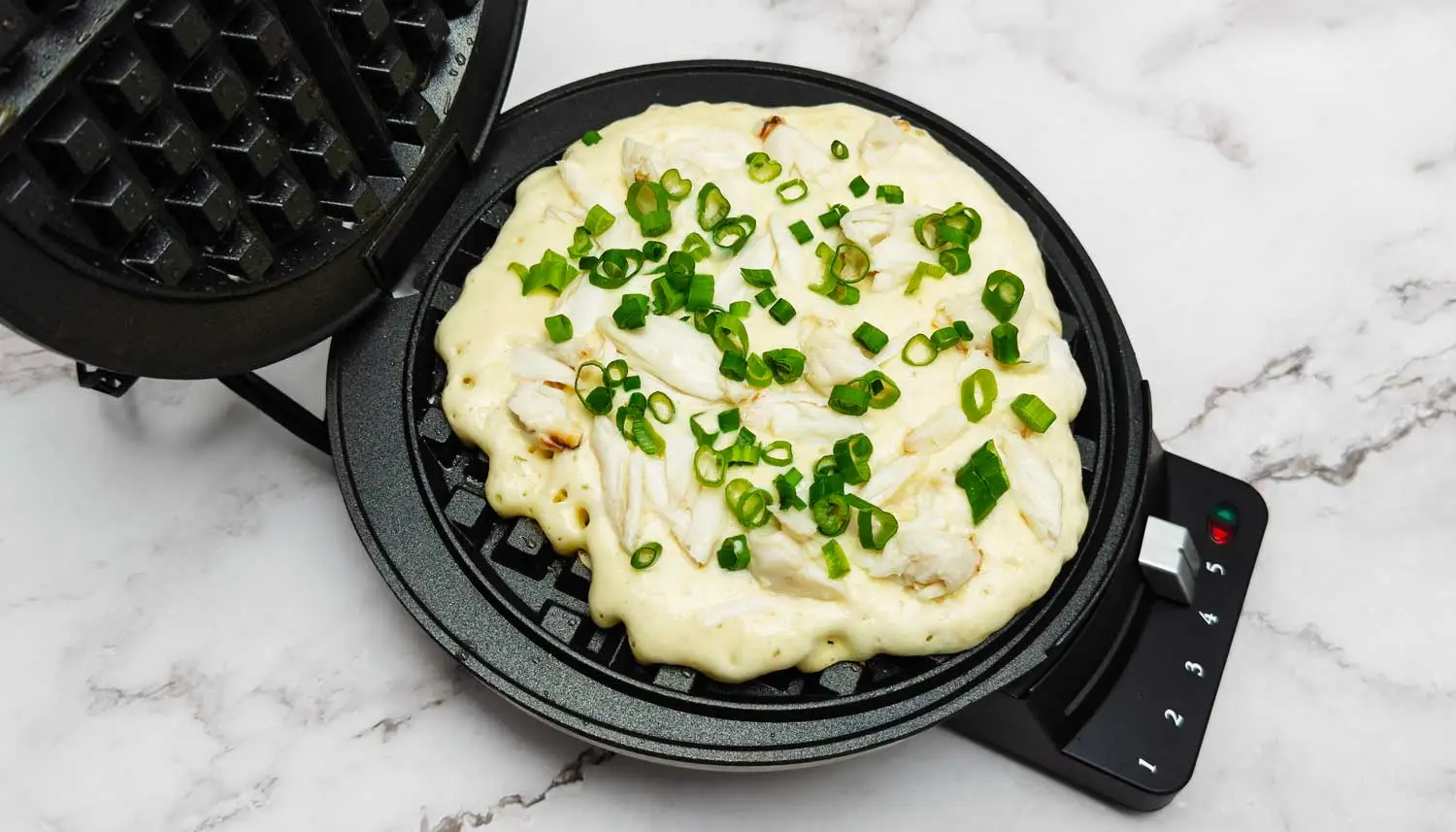- Heat your waffle maker according to the manufacturers recommendations. My waffle maker is a round one and makes waffles that are about 7 inches in diameter. Melt 2 tablespoons butter and brush both sides of the waffle maker with a light coating of the butter . Pour a heaping 1/2 cup of batter into the waffle maker, scatter approximately 2 tablespoons crabmeat (tearing apart some of the larger pieces) and 3 tablespoons scallion greens on top of the batter. Close the top of the waffle maker and cook until it is nicely browned. Place on a rack in the oven to keep warm and continue cooking the rest of the waffles in the same manner, brushing with melted butter each time before adding more batter. This makes between 7 and 8 waffles.