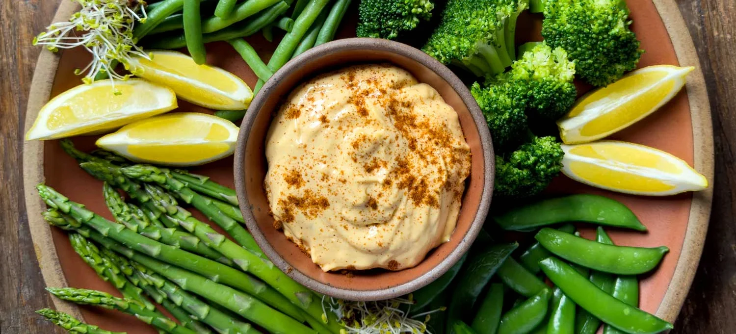 - Arrange the vegetables on a platter, using whatever amounts you’d like, along with the aioli, lemon wedges and optional broccoli sprouts. You can either dip the vegetables in the aioli or spoon some onto individual servings of the vegetables. Enjoy!