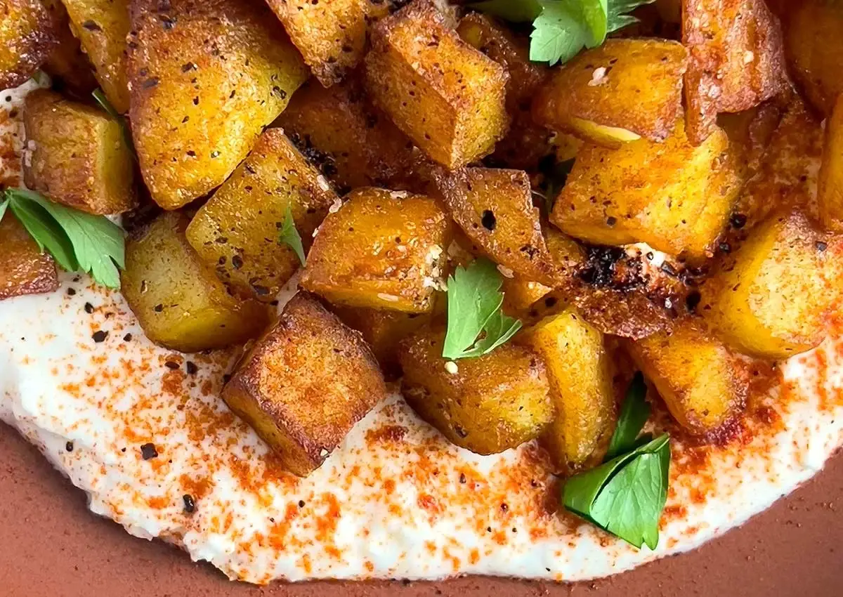 Crispy Cubes of Potatoes are Cooked in a Skillet and Served on a Bed of Creamy Feta Sauce.