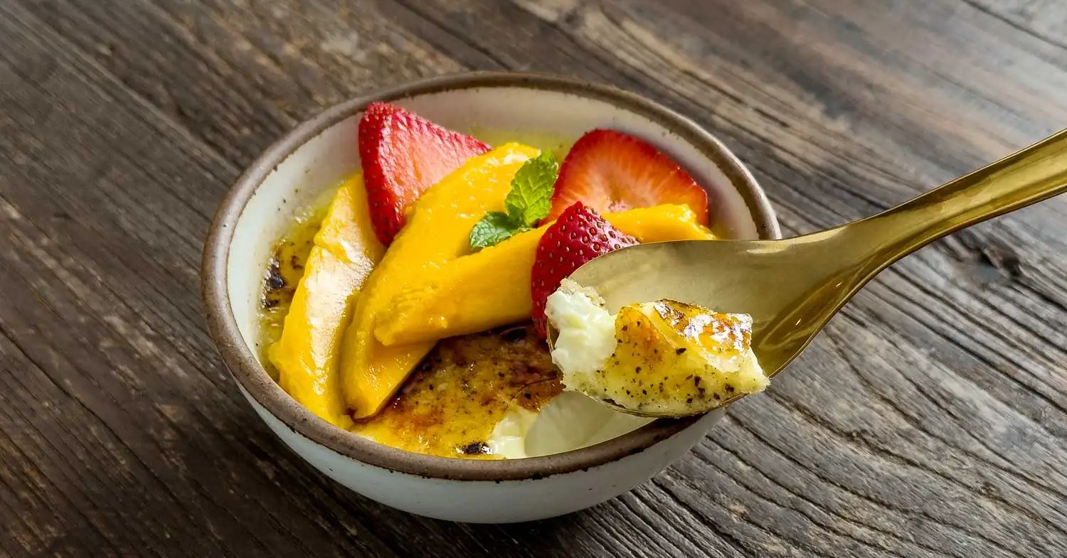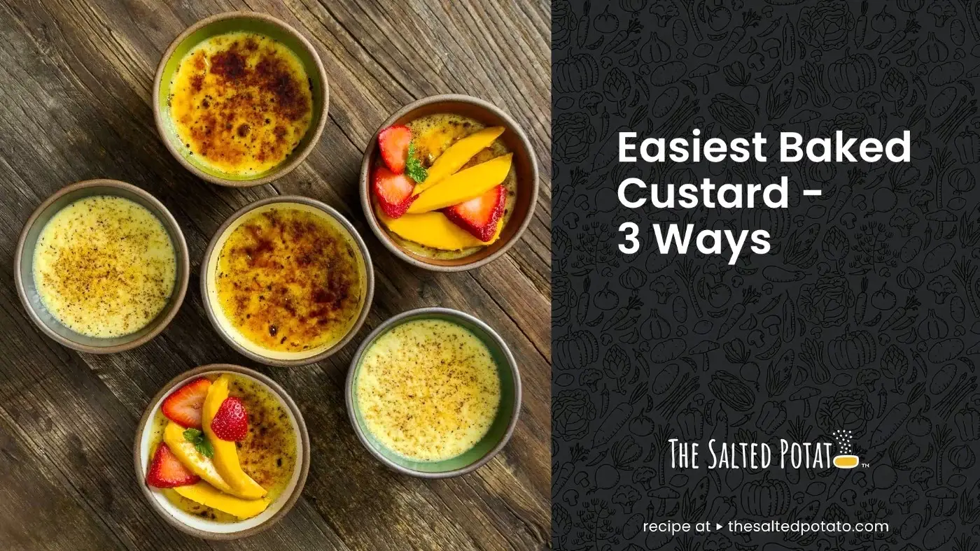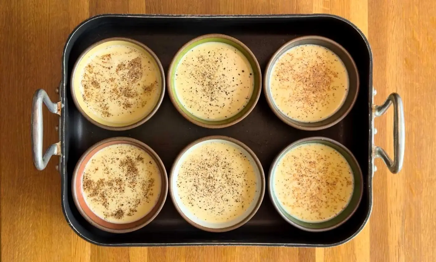 servingsSilky custard easily made by whisking together eggs, egg yolks, sugar, milk, cream, and vanilla. Pour it into cups or ramekins, bake them in a hot water bath for an hour, and chill. You can sprinkle on nutmeg, black cardamom, or pepper and then sprinkle on sugar, blast it with a torch and have crème brûlée, add some strawberries and mangoes, or simply enjoy it plain.