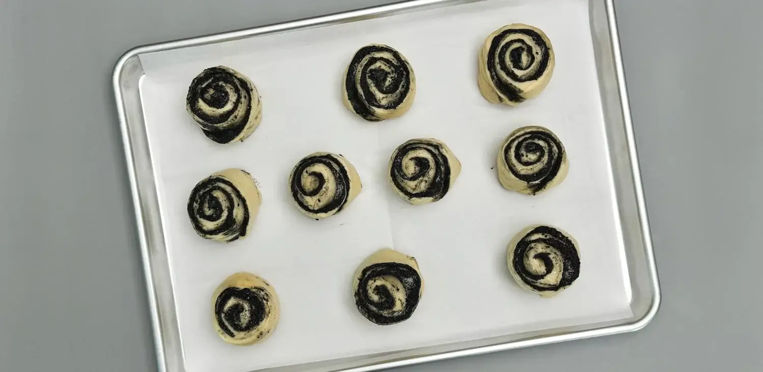 - Roll up lengthwise and slice about 3/4 inch off each end. Slice into 10 rolls, tuck the tail of each roll underneath, and place on a parchment lined half sheet pan, cut side up (see video). Repeat with the remaining half of the dough. Cover with oiled plastic wrap and let rise 45 minutes. Preheat oven to 375° with a rack in the center.