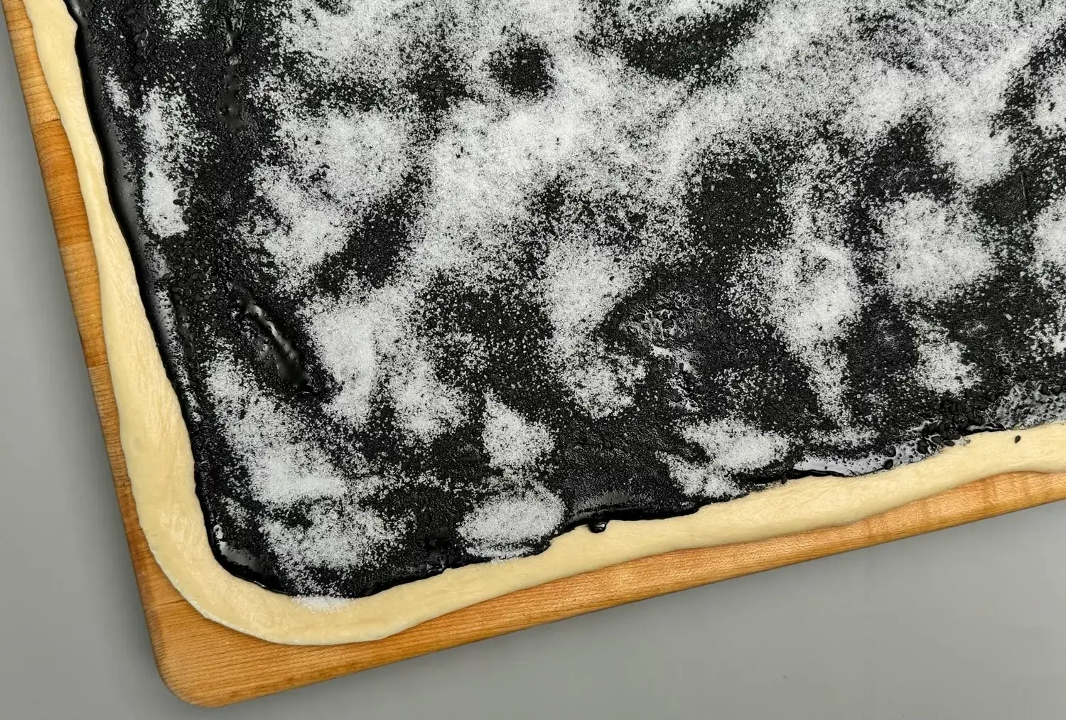 I patted and rolled out the dough, spread it with black tahini * (to which I’d added a little salt), sprinkled on black sesame seeds ,* and sugar. I really wanted the black sesame flavor to be front and center, so I didn’t add any warm spices. I kept it simple.