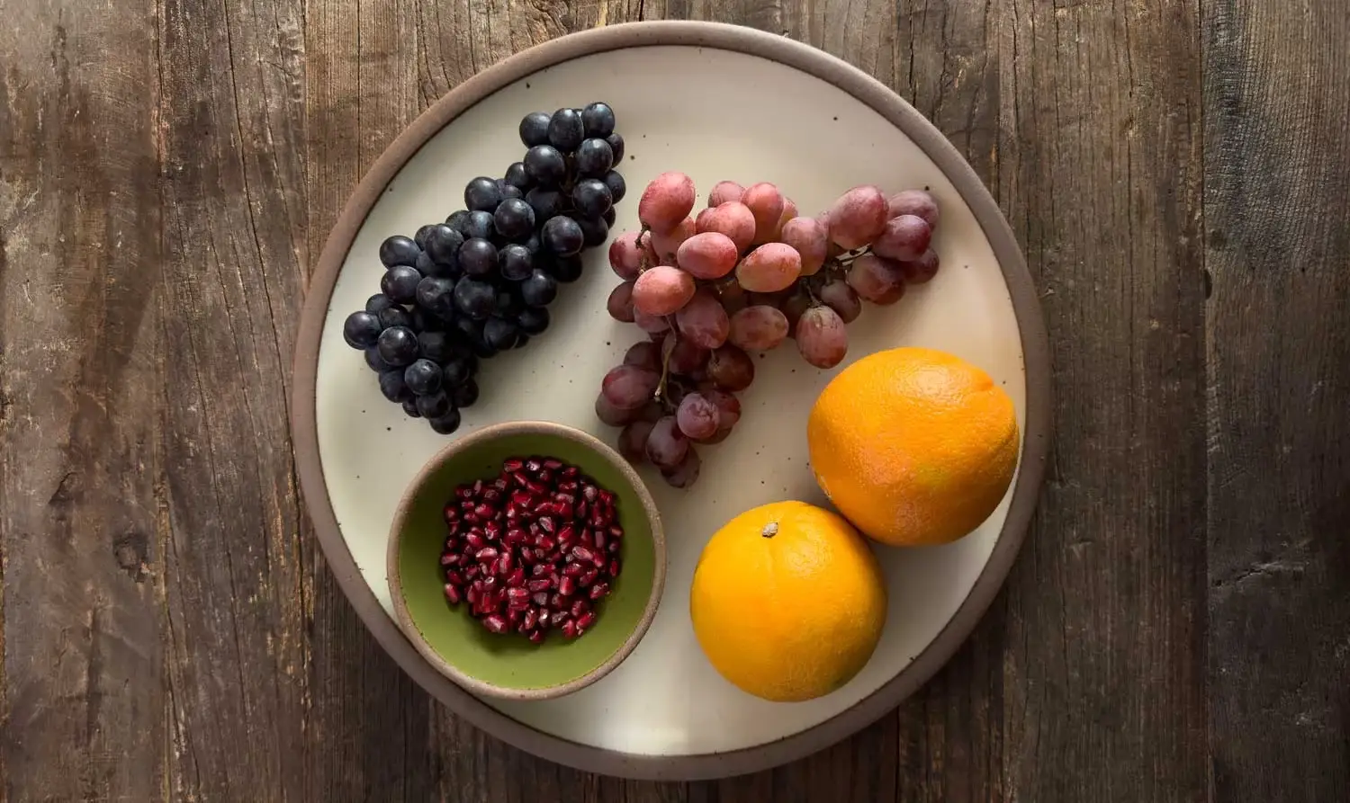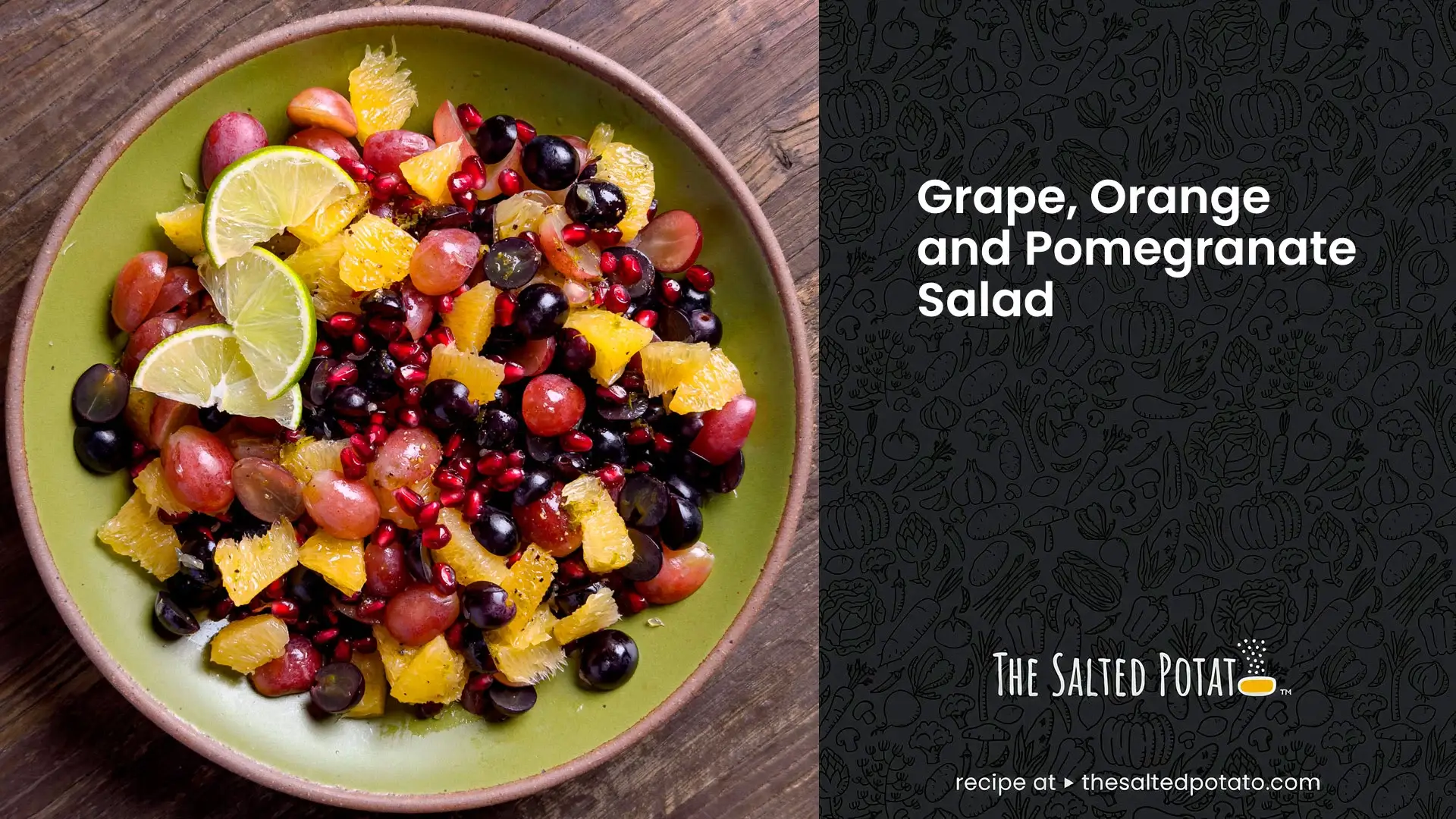 - Slice all the grapes in half lengthwise and place them in a serving bowl. Slice the ends off both oranges. Stand them cut side down on a cutting board and slice off the peel by starting at the top edge of each orange and slicing downward, following the curve of the orange. Continue going around the orange in this way until all the peel and pith have been removed. Slice between each membrane, releasing all the segments of orange. Slice the segments in half and add them to the bowl of grapes. Toss in the pomegranate arils.
