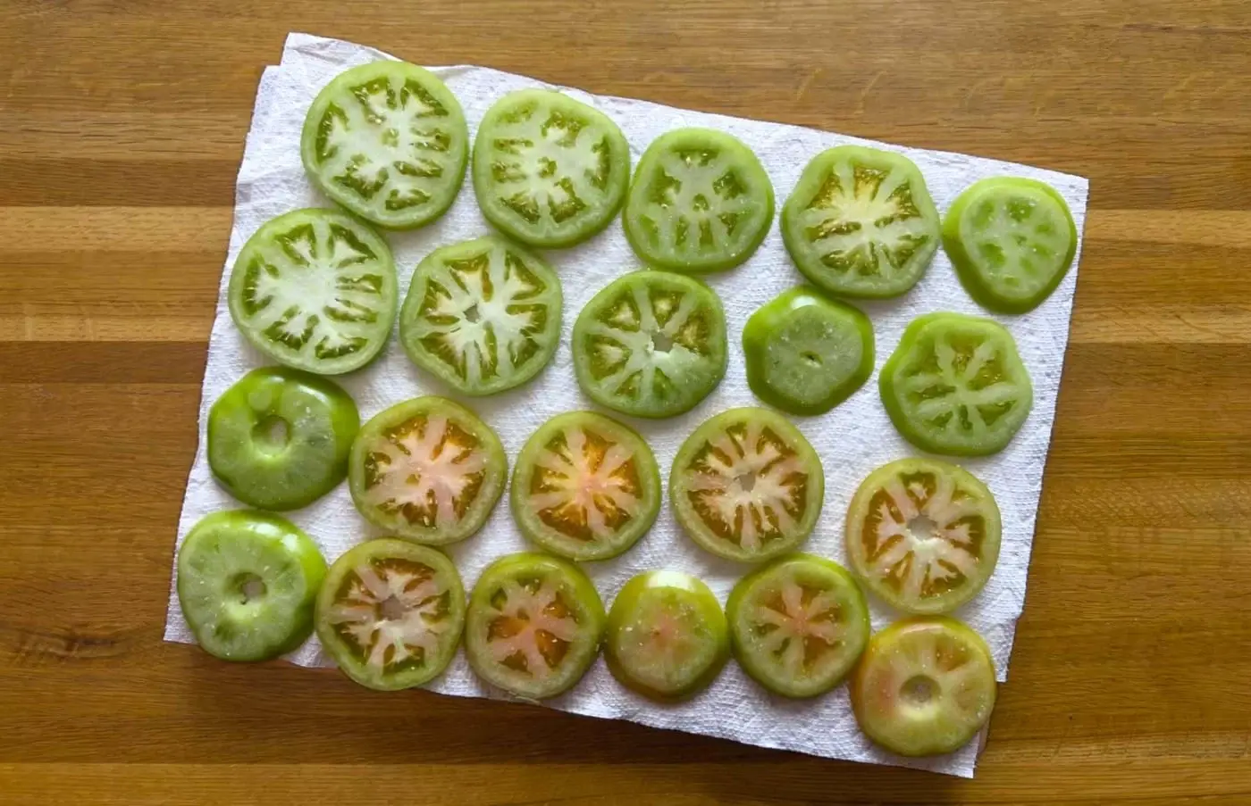 • Core and slice the green tomatoes into 1/8 inch thick rounds. Sprinkle with Morton kosher salt on both sides, using 1 teaspoon salt in total, and place on paper towels to drain for 30 - 60 minutes. Wipe dry with paper towels right before you put them into the pie crust.