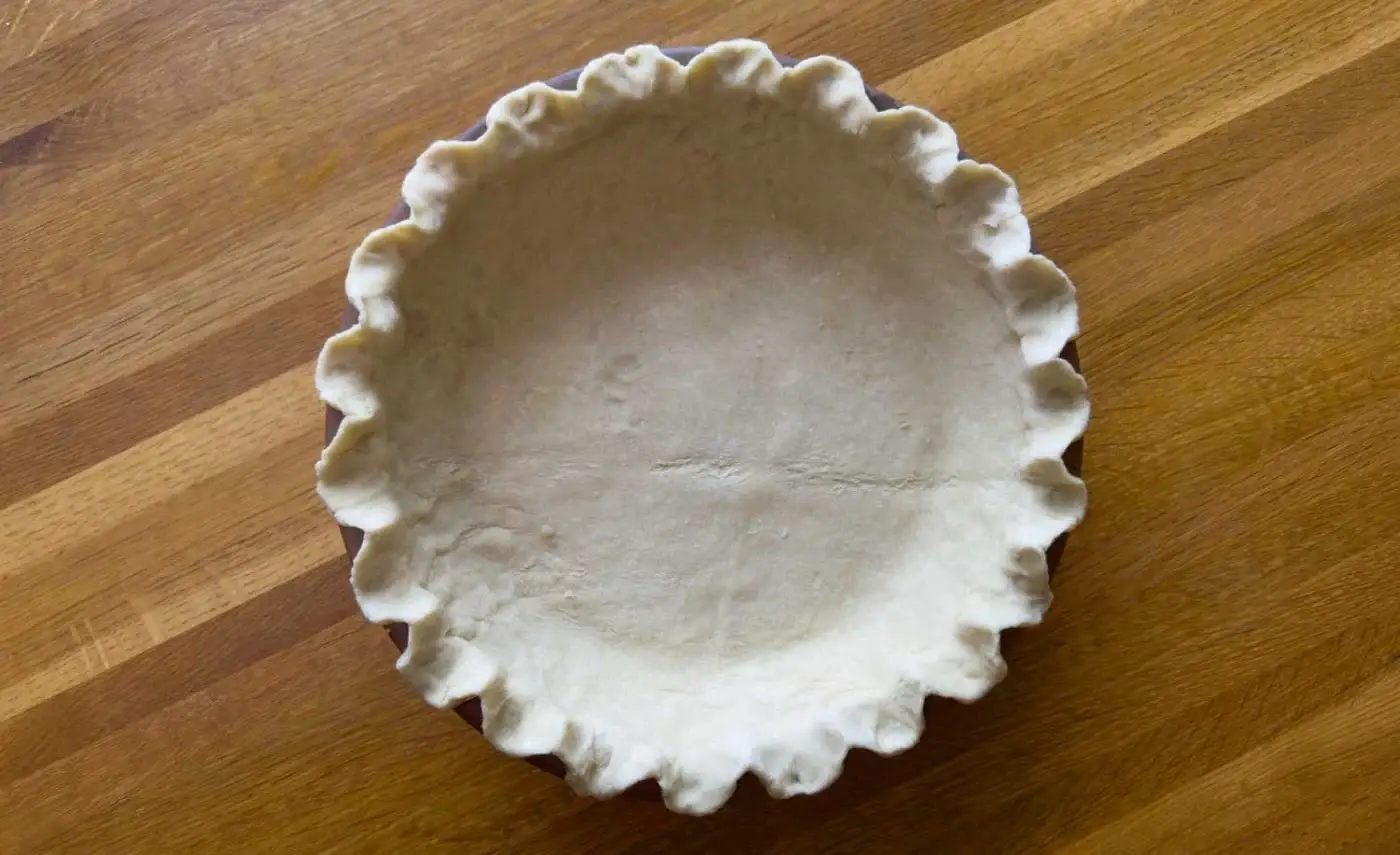 • Place the vinegar in a measuring cup and add enough ice water to bring the measurement to 1/3 cup. Remove the lid of the processor and sprinkle on the water/vinegar. Replace the lid and pulse very briefly - only once or twice until the water is incorporated. Turn the dough out onto a generously floured surface. Sprinkle a little flour onto the top of the dough and roll it out to a 15 inch circle. Ease it into a 10 inch deep dish pie plate and trim the edges so they are 1/2 inch larger than the pie dish. Roll under the edge of the crust and flute it. Chill in the refrigerator for at least 30 minutes. This can even be made the day before, covered and chilled.