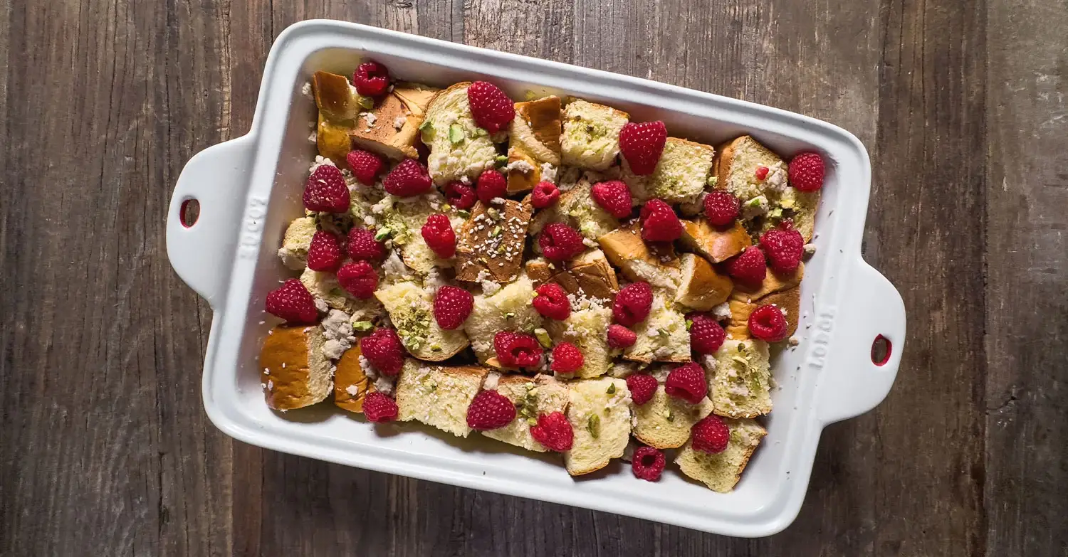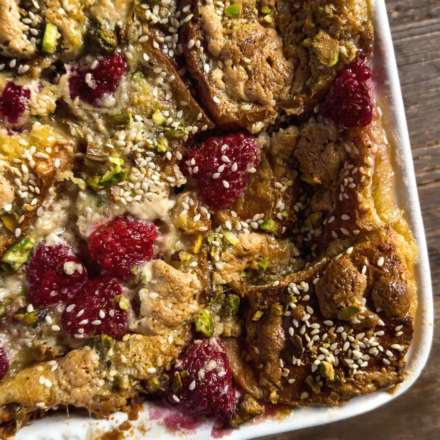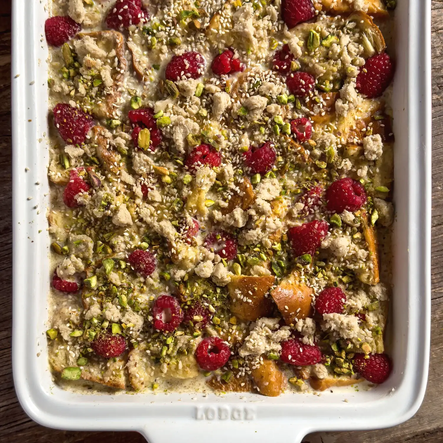 - After putting the raspberries, halvah, and bread in the pan, sprinkle on the sesame seeds and pistachios. Continue with the recipe as written. Serve, and Enjoy!