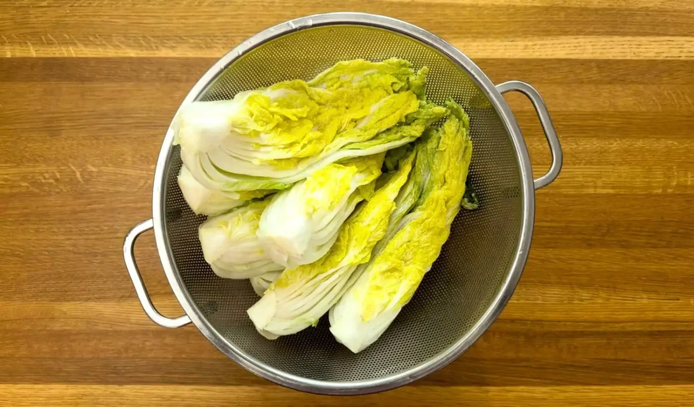 It begins by separating a couple heads of napa cabbage into quarters and soaking them in salted water which will draw out a lot of the liquid from the cabbage. After a few hours of soaking, the cabbage is thoroughly rinsed and squeezed dry. I want to put in a word here about keeping the cabbage leaves intact and attached to the core rather than chopping them. Personally, I think there is a big difference in the end result. The whole leaves retain more of their structural integrity and I also think they simply taste better.