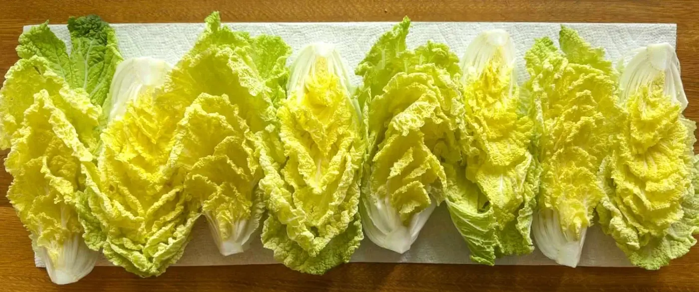 After coating the cabbage leaves with the sauce, each quarter is folded in half and placed into a one gallon jar, where it is left to sit at room temperature for 2 – 3 days, until it begins to ferment and sour. After that it is refrigerated for 2 to 3 weeks until it is fermented.