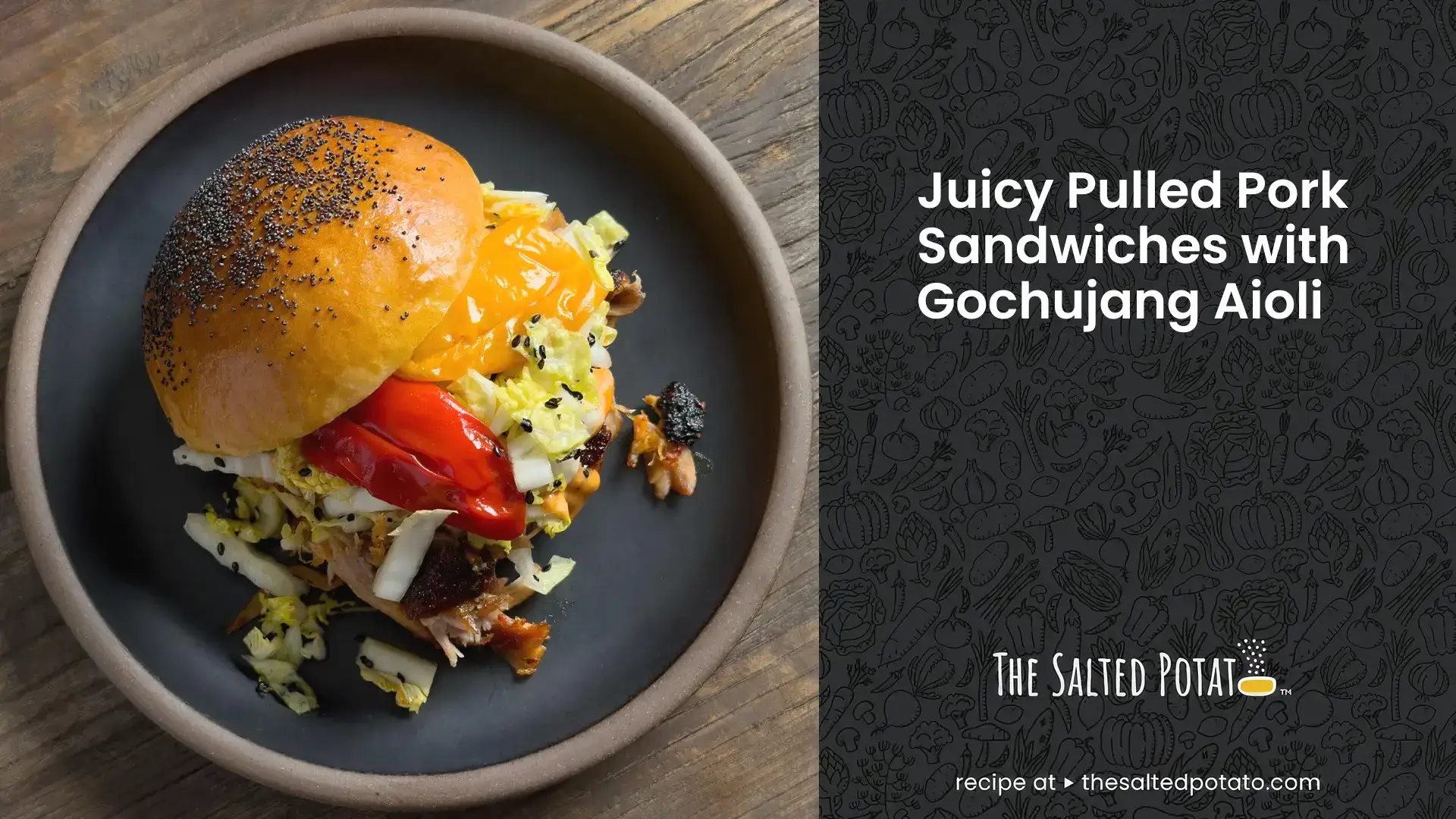 - Slice each roll in half, pile on the shredded pork, top with a healthy spoonful of gochujang aioli, some of the Napa cabbage salad, and a couple of peppers. That’s it. You’ve now got a fantastic sandwich.