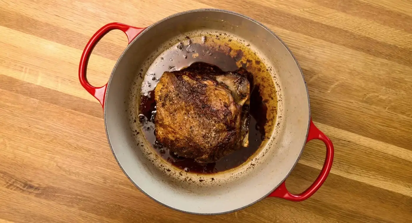 - Depending on your preference, either break the pork into chunks or shred it. Spoon off the excess fat from the roasting pot and spoon the pan juices over the meat. Serve with the sauce on the side and Enjoy!