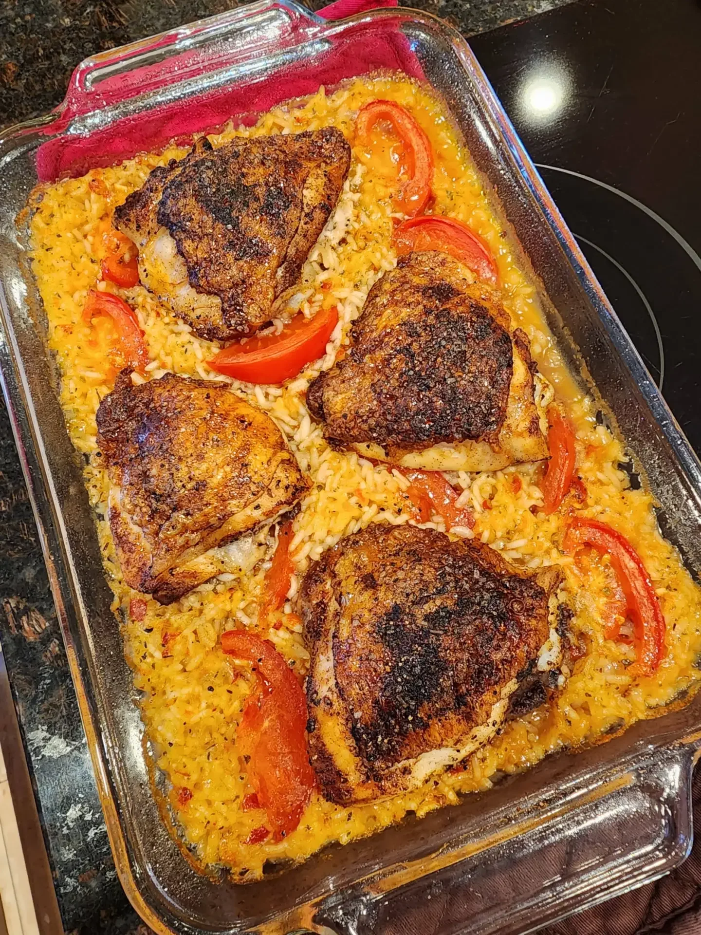 servingsCrisp maple syrup glazed chicken thighs rest on top of baked Carolina Gold Rice, which is cooked with chicken stock, saffron threads, Morita chipotle flakes, orange juice and zest, garlic and tomato vinegar. Wedges of fresh Campari tomatoes are added during the last few minutes of roasting resulting in a brilliantly flavored dish. Not your typical chicken and rice.