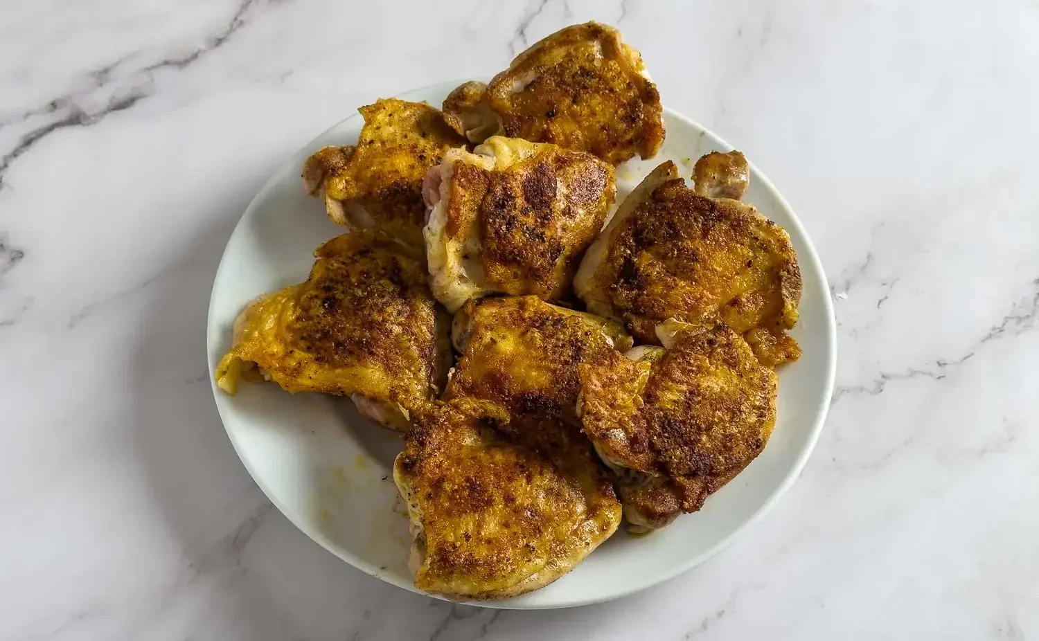 - Preheat the oven to 375° with a rack in the center. Making sure the chicken thighs are thoroughly dry, sprinkle them liberally with salt, hot smoked paprika, and black pepper. Heat the vegetable oil in a large hot skillet. Over medium heat, add half the chicken, skin side down and let brown without moving the pieces of chicken for 5 - 7 minutes. Do not flip the pieces of chicken. You are only browning the skin side. Remove the chicken to a plate and repeat with the remaining chicken thighs.