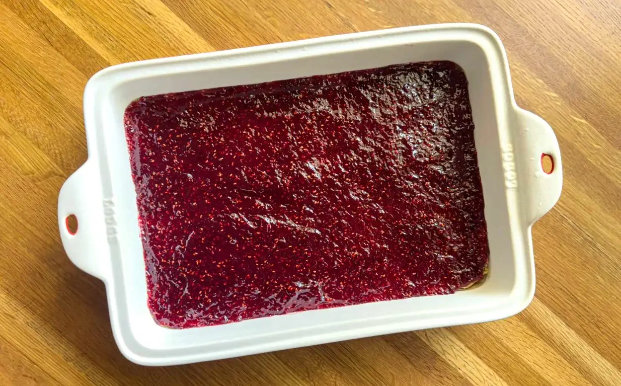 - Remove the lid from the jar of raspberry jam and heat the jar of jam for 30 seconds in the microwave in order to loosen it up a little. Remove the dish from the freezer and spread the jam evenly over the crust. Place back in the freezer for 20-30 minutes.