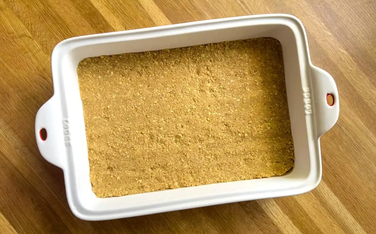 - Press into a 13 x 9 dish which you’ve sprayed with oil and lined the bottom with parchment. Place in the freezer for 30 minutes.