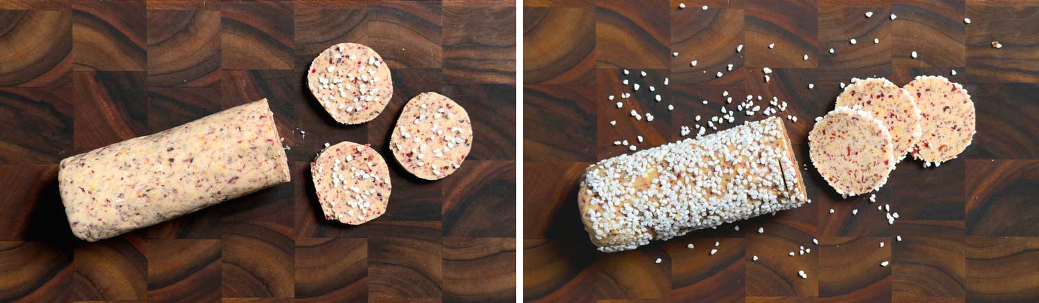 You have a choice as to how you’d like to finish off the cookies. You can roll the log in the finishing sugar of your choice and then slice them. Or you can slice them first and sprinkle the tops with finishing sugar. I chose to use Swedish pearl sugar * and rolled half the log in the sugar and sprinkled the other half with the sugar after they were sliced. It’s up to you.