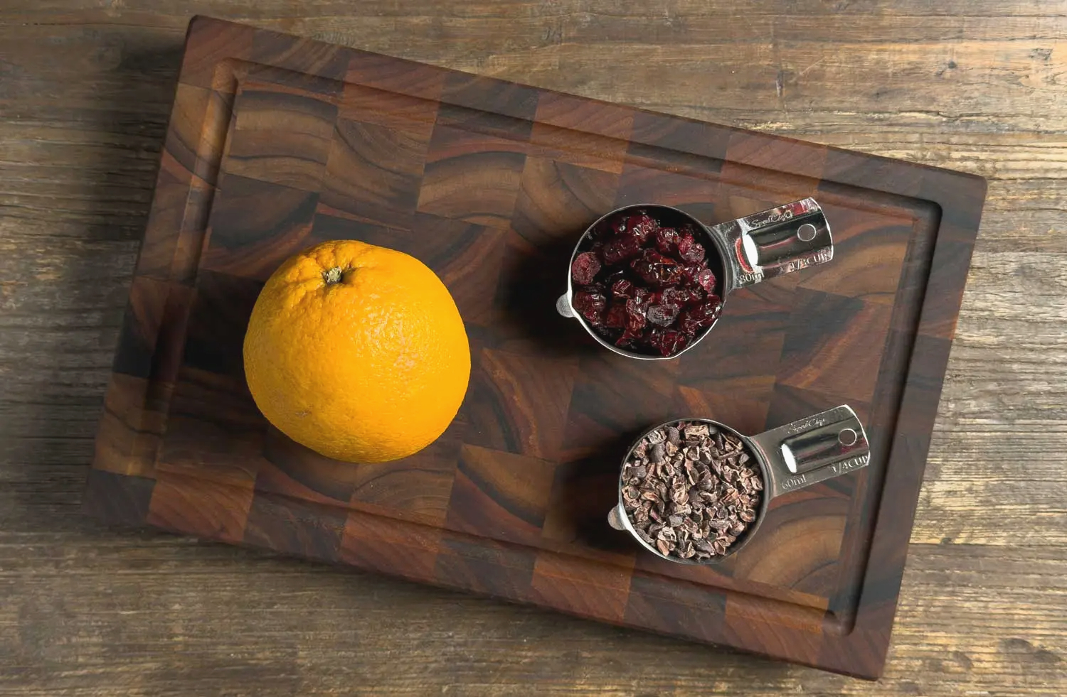 I went with orange for the citrusy end of flavor, dried cranberries for both their tart and sweet sharpness, and cacao nibs * for their texture and complex bitter flavor. This trio of flavors works really well together.