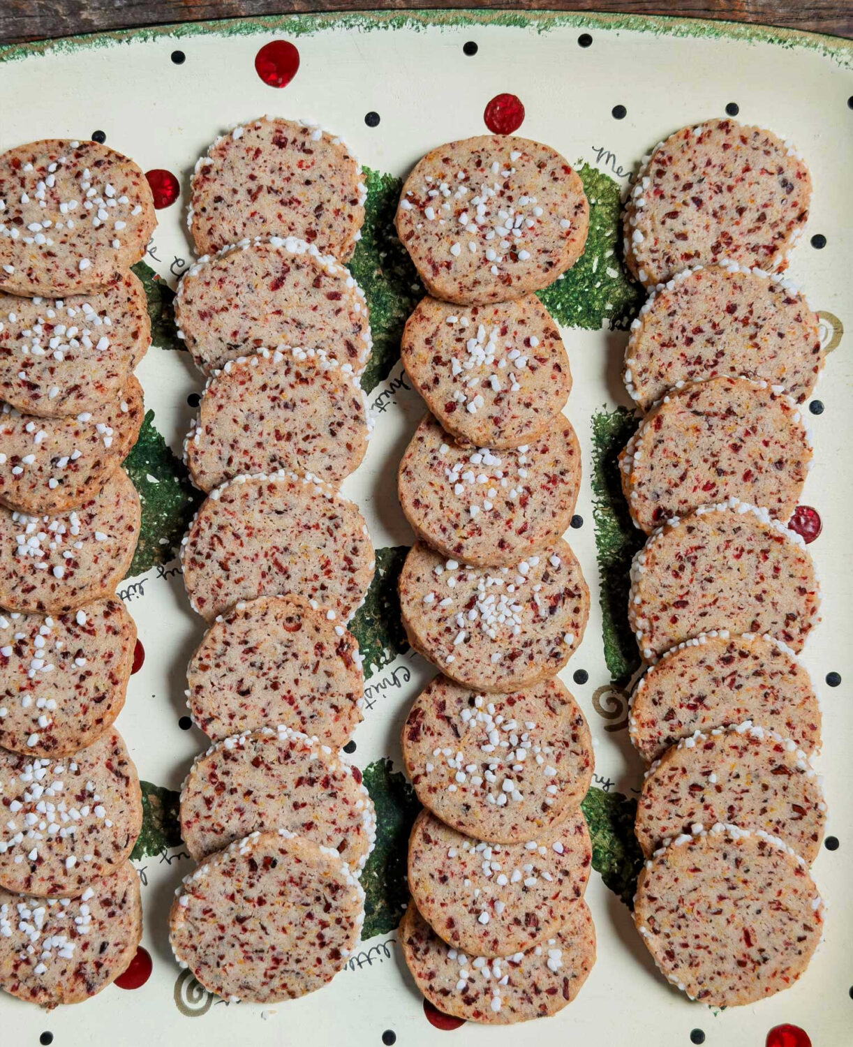 - Preheat the oven to 375°. Line 2 half sheet pans (13 x 18 inches) with parchment paper. Unwrap the dough and either roll it in the finishing sugar or sprinkle the sugar on top of each slice. Cut into 1/4 inch slices with a sharp knife. You will have 40 slices. Arrange 20 slices on each sheet pan. I prefer to bake these one sheet at a time. Put one pan of sliced cookies in the refrigerator while the other one bakes. Bake for 11 minutes or until edges of cookies are just beginning to turn golden, turning the sheet pan from front to back at the halfway point of baking. Let the cookies completely cool in the pans. These will store beautifully in an airtight container at room temperature for a couple of weeks, but I can’t imagine them lasting that long. Enjoy!