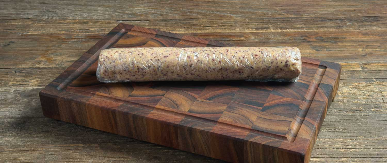 - Form the dough into a rough 10 inch log on a piece of plastic wrap. Fold the plastic over the dough and roll the covered dough into a smooth 10 inch log and seal. Wrap in foil and freeze for at least 2 hours (I always let it freeze overnight).