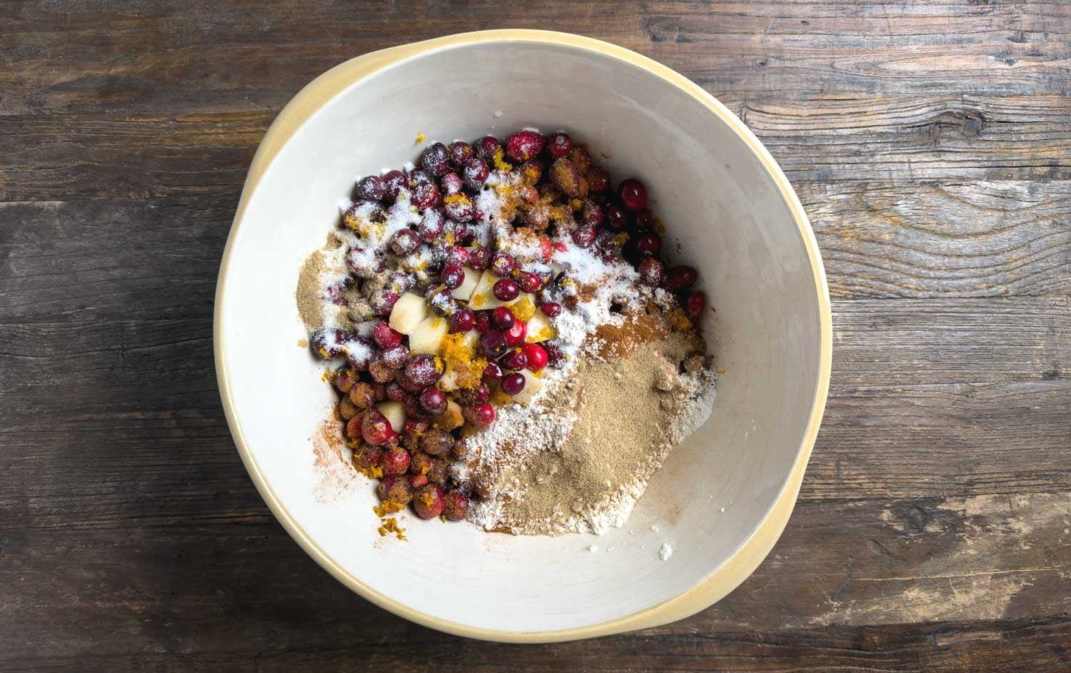 I love all things apple, but seeing as I had a bowl full of ripening pears sitting on my counter, I thought a pear version would be lovely. I’ve learned something the hard way from baking with pears: They can become very dulled down and flat in flavor when subjected to heat. I decided to counteract this by adding fresh cranberries. They ended up being perfect with the mild pears.