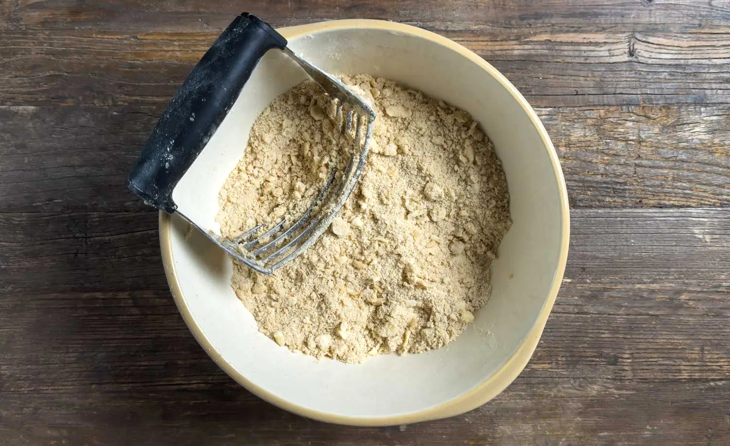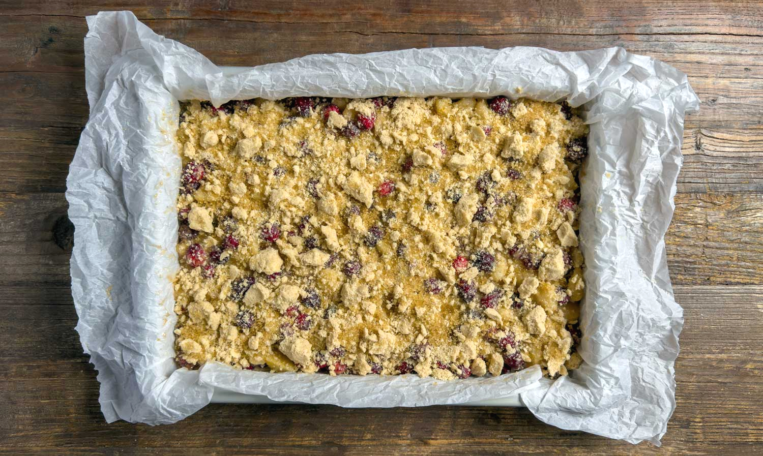 - Preheat oven to 350° with a rack in the center. Line a 13 x 9 baking dish or tin with parchment paper. I like to fully crumple the paper first, this way it fits into the dish easier. Whisk together 180g (1 1/3 cups) all-purpose flour, whole wheat flour, baking powder, 1/2 teaspoon salt, and light brown sugar in a medium size bowl. Add the butter, and using either your fingers or a pastry cutter, work in the butter until it is evenly distributed throughout the dry ingredients and resembles sand, but with a few bigger pieces scattered throughout. Pat 2/3 (about 400g) of this mixture into the lined pan and set the remaining third aside. It will be the streusel topping.