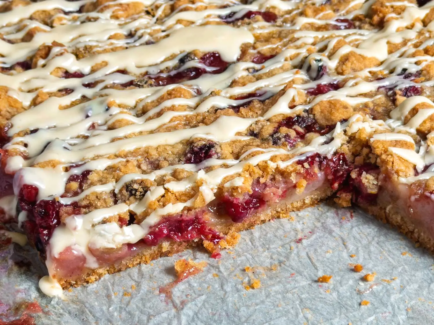 - In a small bowl, whisk together the powdered sugar, orange juice, melted butter, and orange oil. Drizzle on top of the cooled slice, cut into squares, serve, and Enjoy! Cover and store at room temperature for several days.