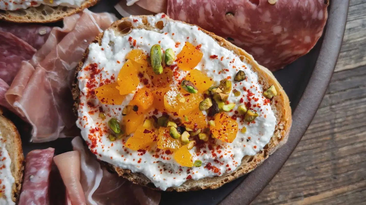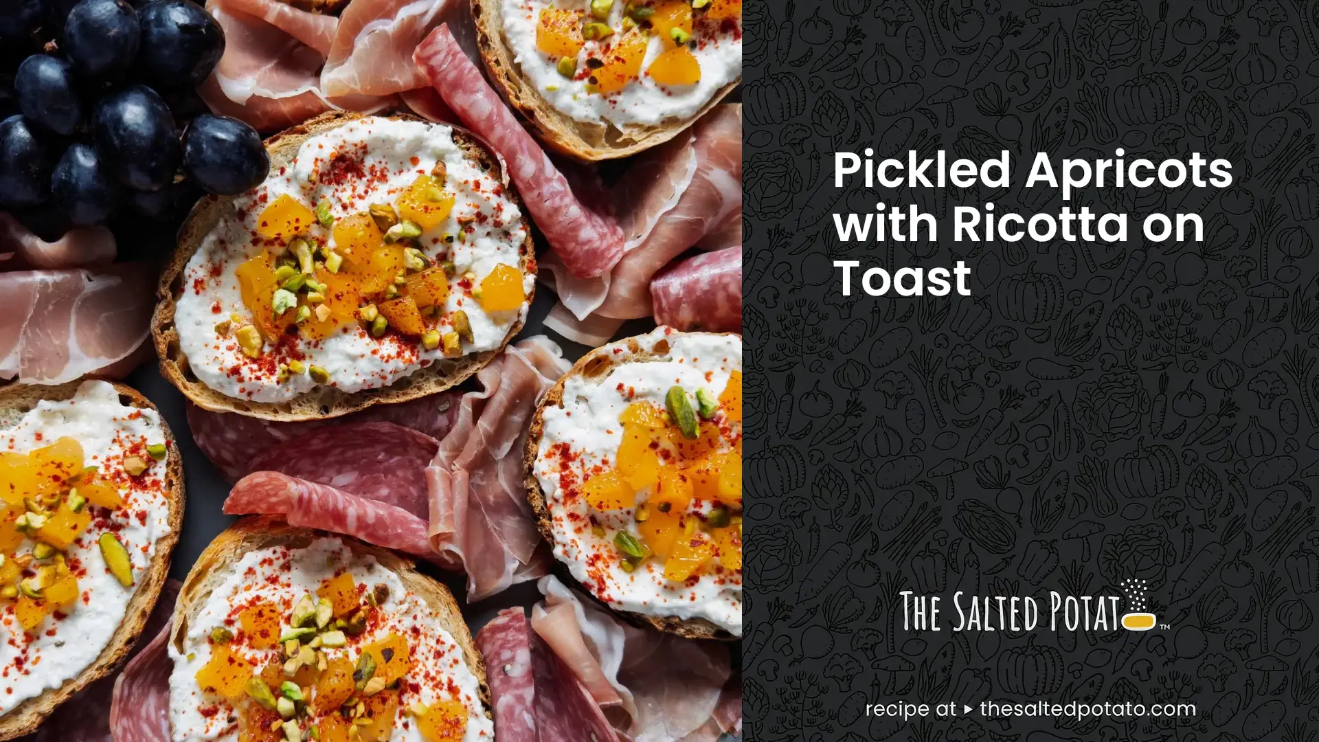 Homemade seasoned ricotta is spread on toast and topped with easy pickled dried apricots. Sprinkle on gochugaru and crushed pistachios. Serve on a big platter with sliced prosciutto and soppressata. Add a big bunch of black grapes and you've got one heck of a delicious meal!
