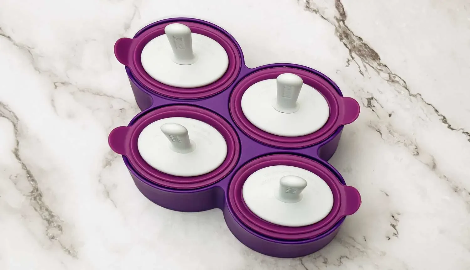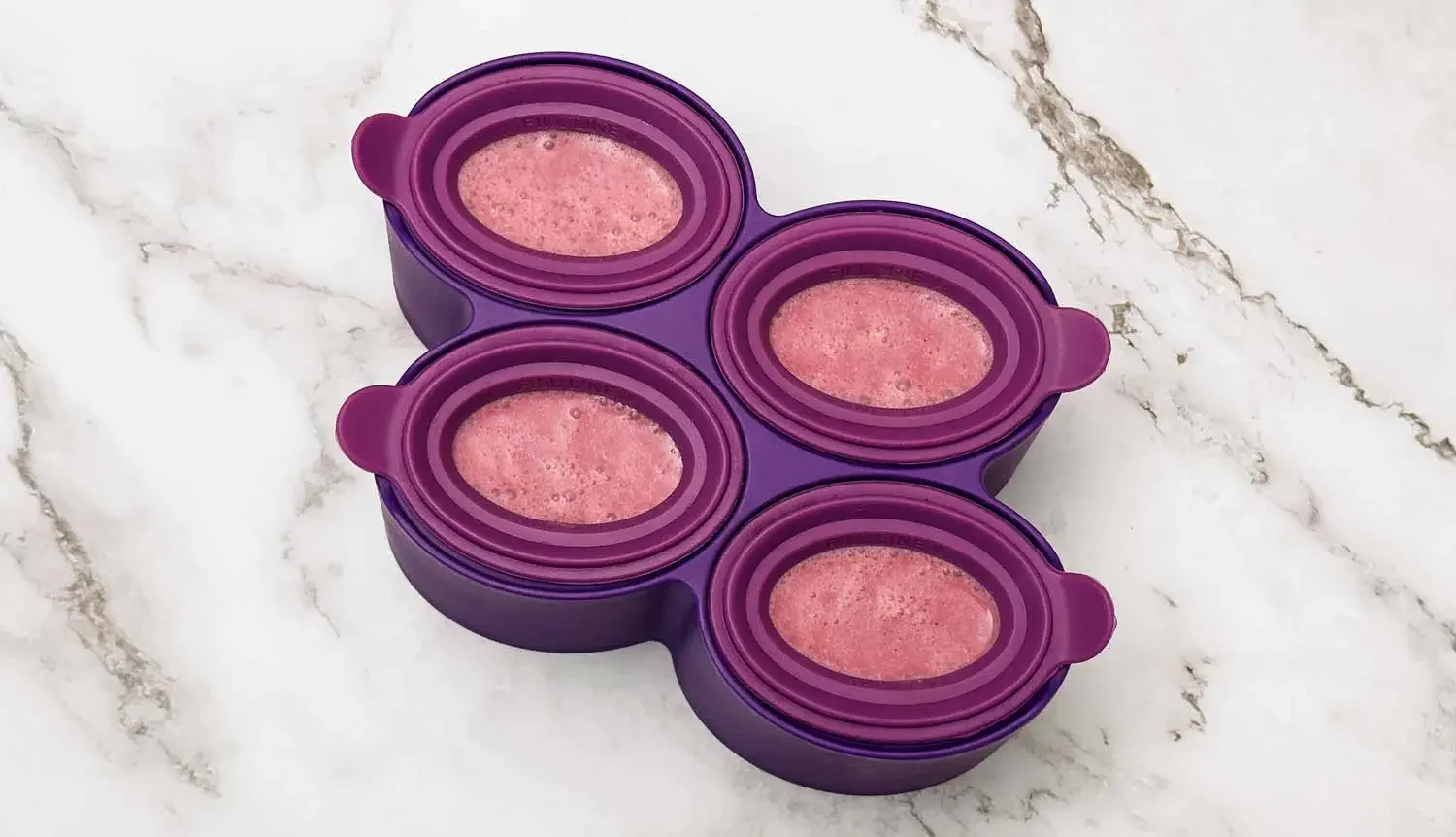 I bought these ice pop molds * a few years ago and put them to good use here. Use any kind of popsicle molds you’ve got, but if you’re in the market for new ones, I can find no fault with these .* They perform exactly as described. The individual silicon molds sit inside the plastic base.
