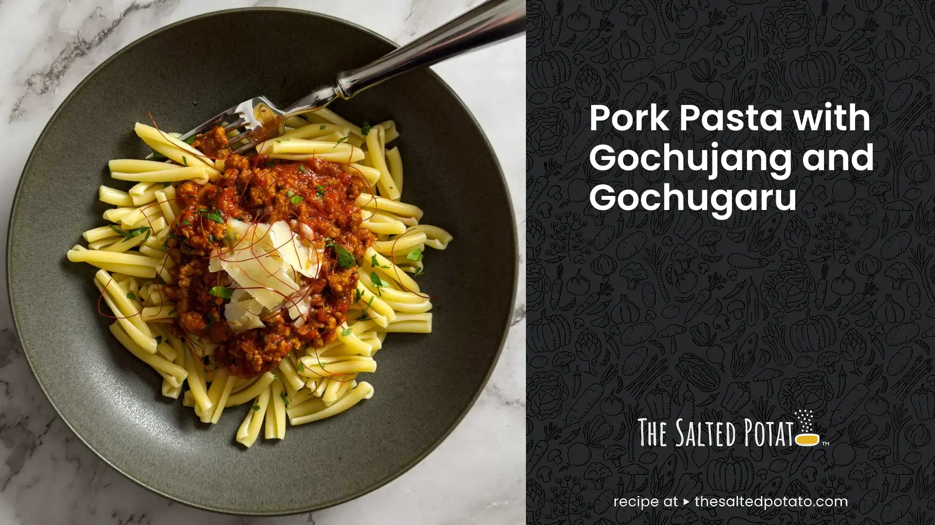 This pasta sauce is made with ground pork, tomatoes, gochujang (Korean chili paste), and gochugaru (Korean chili flakes), plus butter and a few other ingredients. It ends up being a deeply flavored, but mellow sauce. It's also quick and easy!
