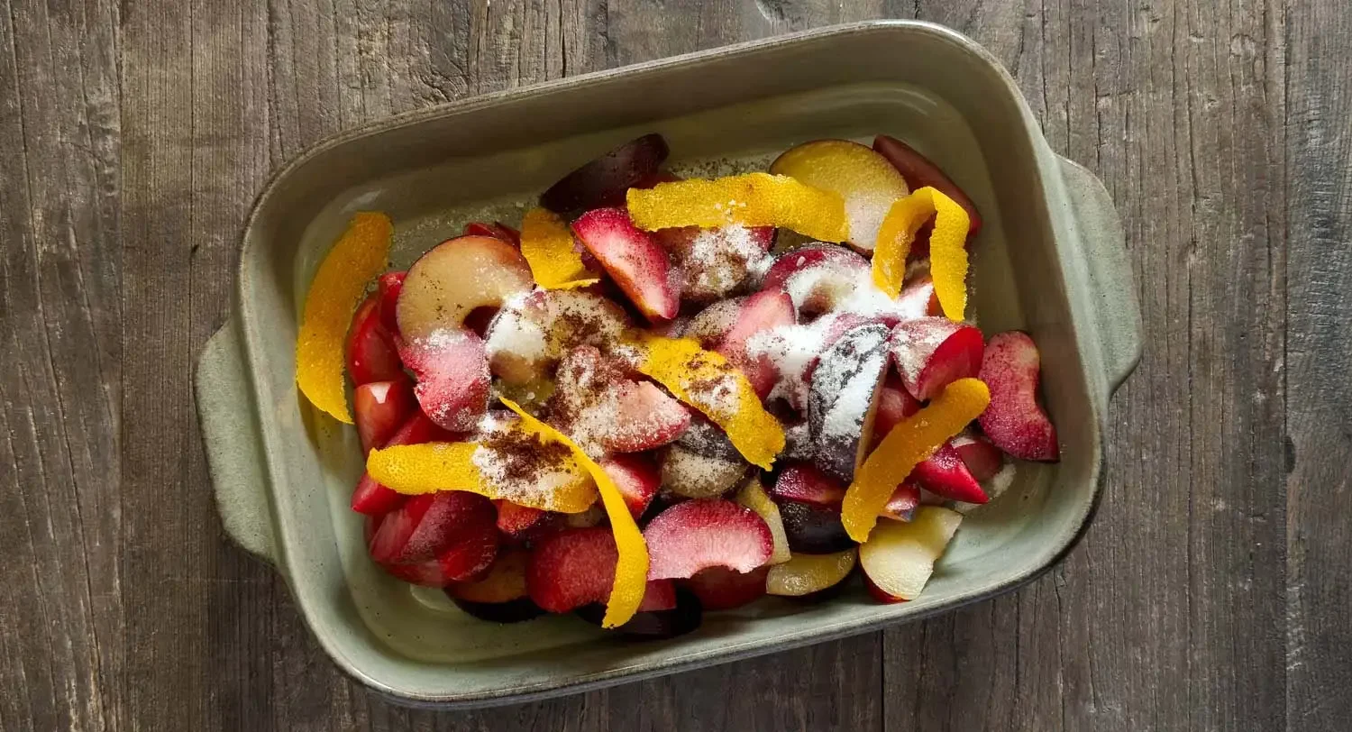 - Preheat oven to 375° with a rack in the center. In 2 quart baking dish, combine plums, sugar, salt, sumac, orange peel, Fiori di Sicilia or vanilla, and black pepper. Cover with foil and bake for 40 - 50 minutes. Check to see if your plums are nice and tender at the 40 minute mark. If they need more time, cover and put back in the oven for 5 - 10 more minutes.