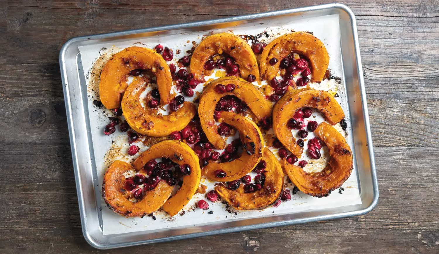 - Place the squash on a parchment lined half sheet pan (13 x 18 inches) and pour over any seasonings left in the bowl. Roast for 25 minutes. Flip the pieces of squash, scatter the cranberries around the squash, return to the oven and roast for 20 more minutes. The cranberries should have burst open and the squash should be fully cooked and brown on the edges.